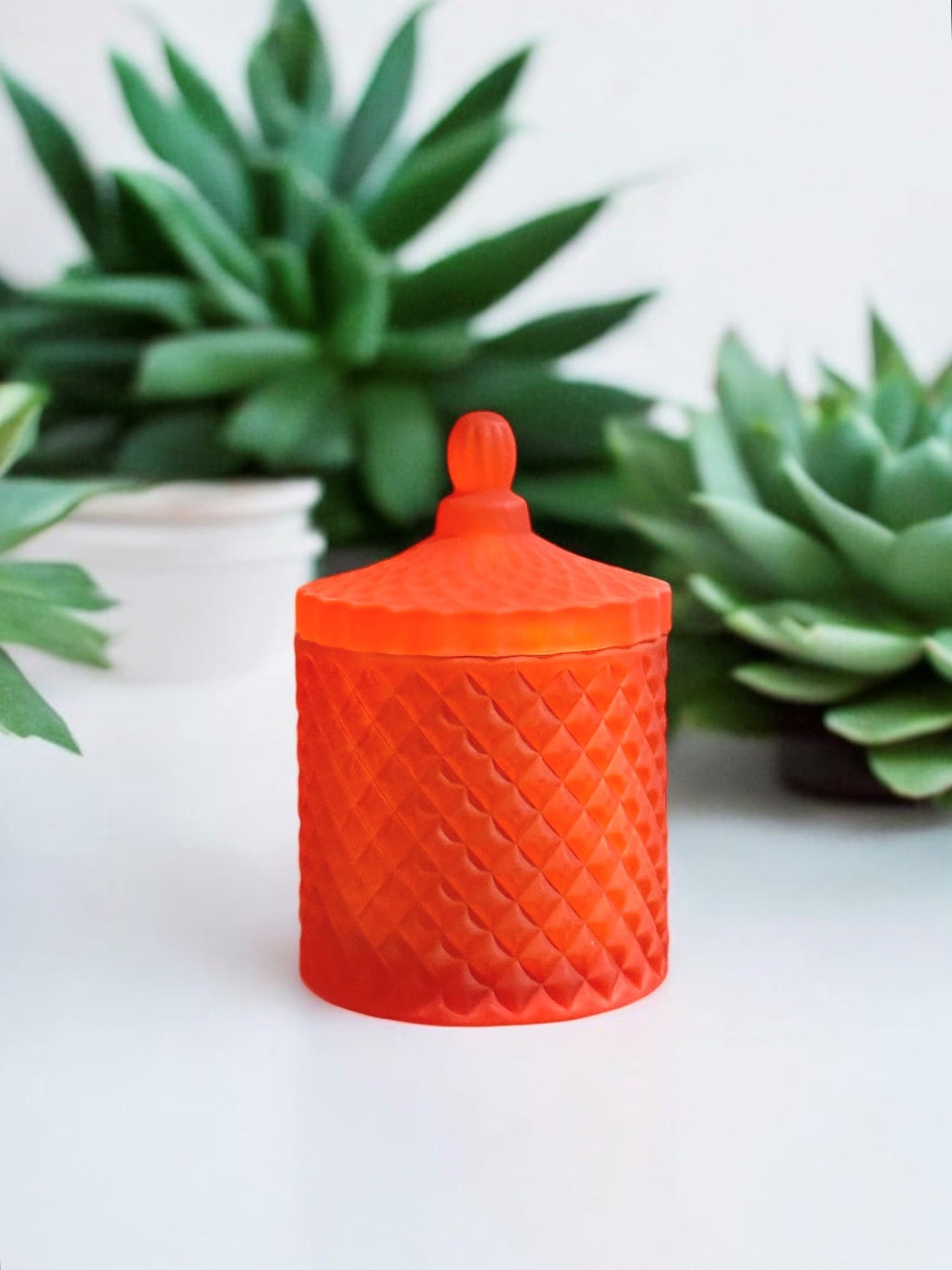 Add a touch of elegance to your home with the Diamond Queen Candle. This 250g candle is encased in a stunning, bright orange glass jar with a diamond-textured design and a stylish lid, making it both a scent and decor statement. Infused with a luxurious fragrance, it fills your space with a warm glow and captivating aroma. Perfect for both minimalist and vibrant interiors, this candle serves as an ideal gift or a chic addition to your own home. The Diamond Queen Candle combines luxury and style, bringing sophistication to any room.