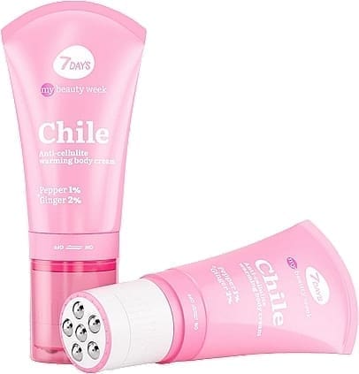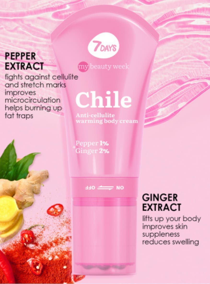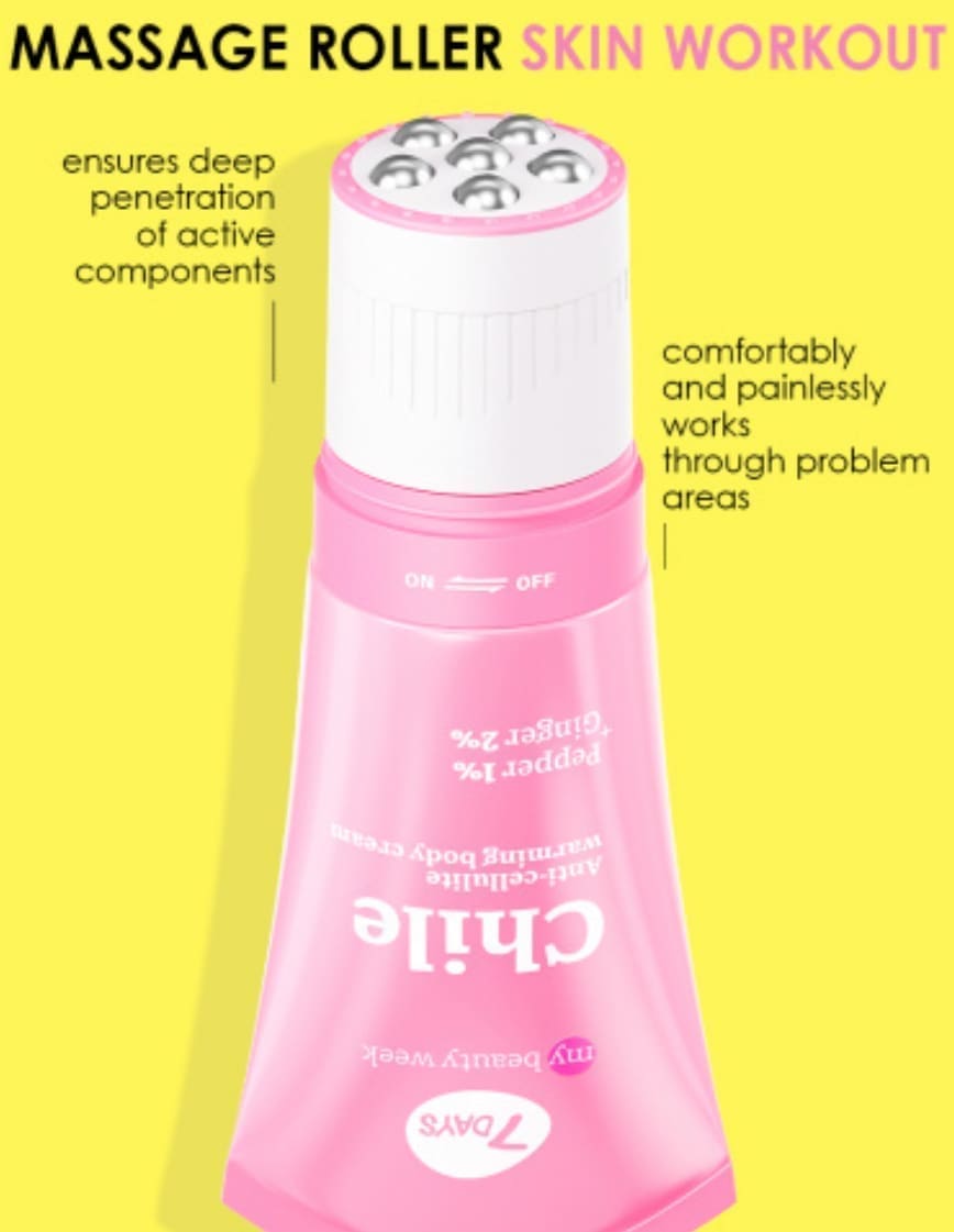 Modeliuojantis kremas + masažinis volelis 2in1 7DAYS CHILE – tai 3D masažas + korėjietiška kosmetika su aktyviais komponentais: pipirais, imbieru.