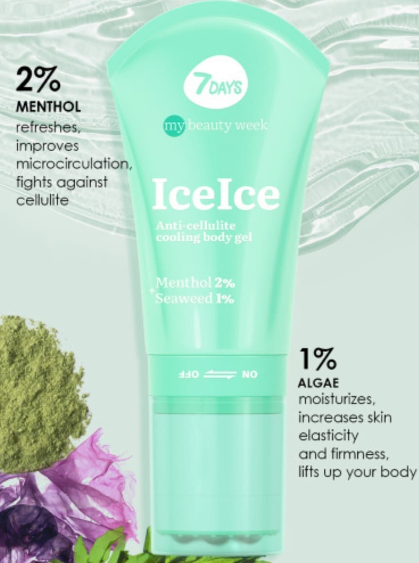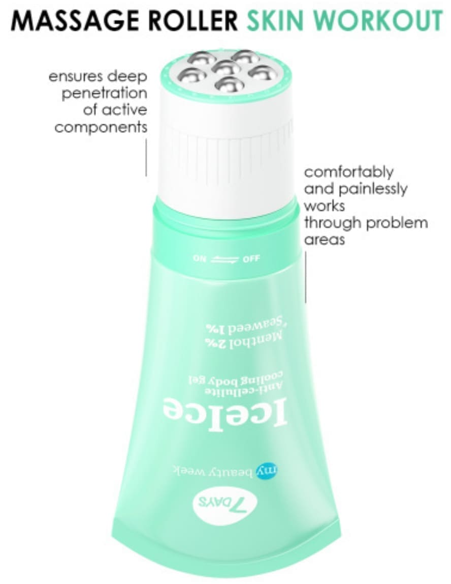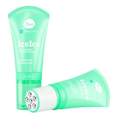 Modeliuojantis kriogelis + masažinis volelis 2in1 7DAYS ICEICE – tai 3D masažas + korėjietiška kosmetika su aktyviais komponentais: mentoliu, dumbliais.