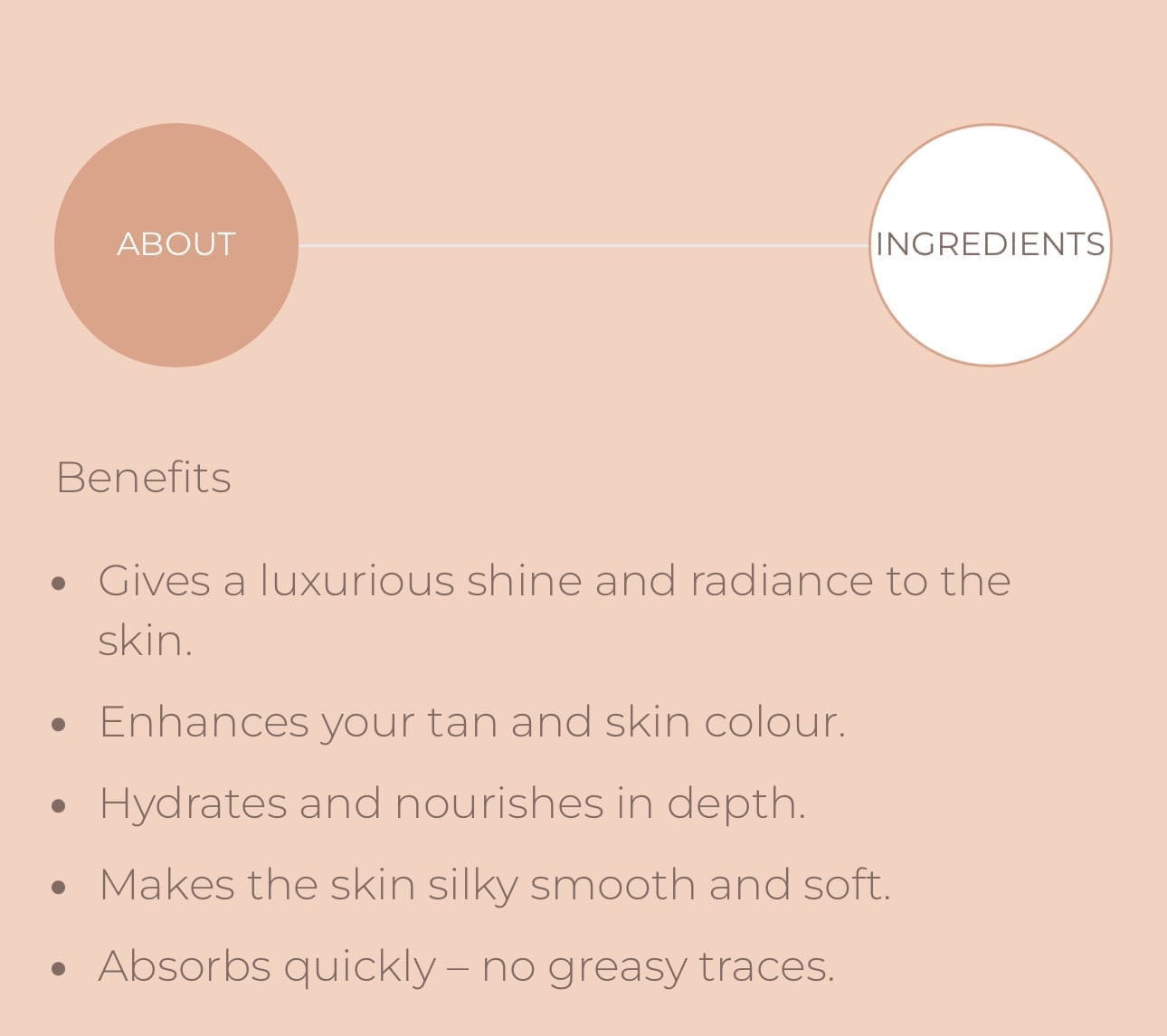 Dėl natūralios žėručio, kuris yra smulkių natūralių mineralinių dalelių, oda tikrai spindi! O turtingas organinių aliejų ir natūralaus vitamino E mišinys drėkina odą, paliekant ją šilkinę švelnią ir pamaitintą.