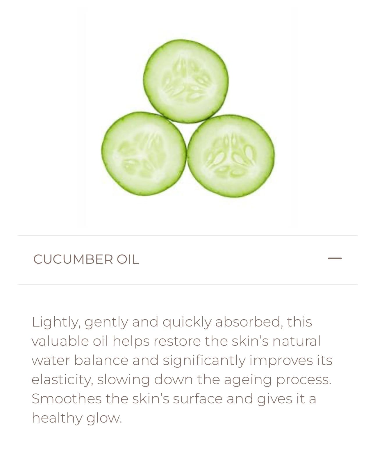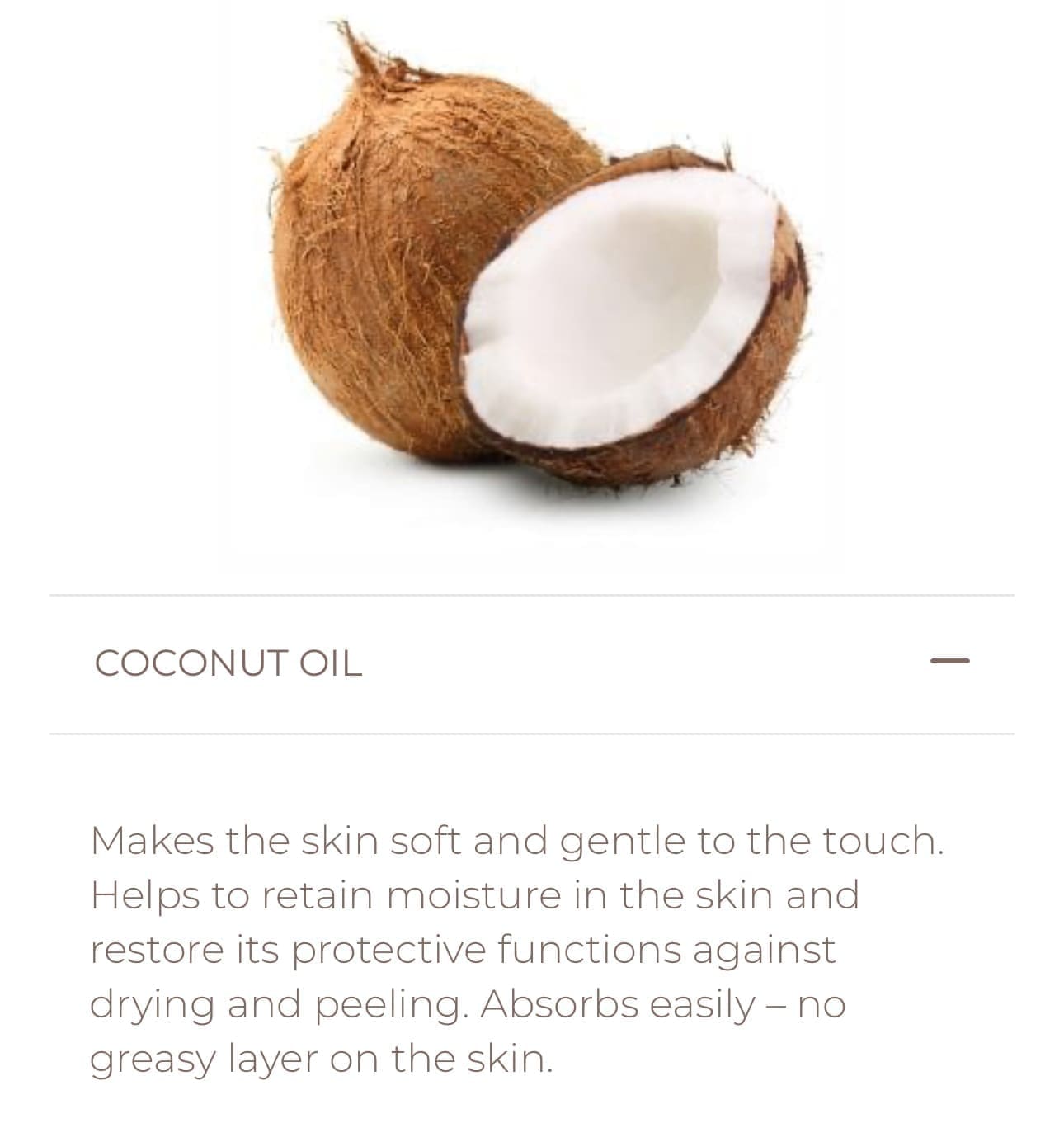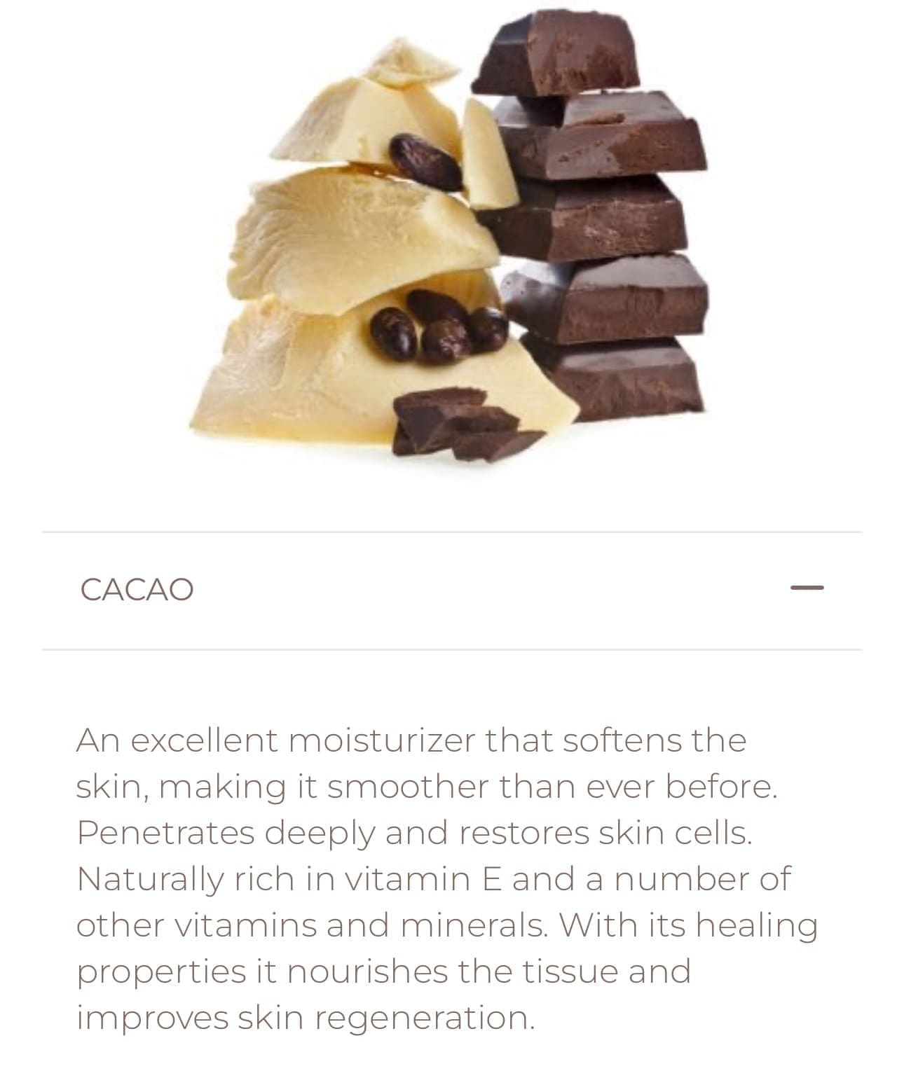 Kaprilinis/Kaprinis Trigliceridas (iš kokoso aliejaus), Kokosų aliejus*, Saldžiųjų migdolų aliejus*, Stearalkonium Hectorite, Propileno Karbonatas, Oktildodecilo Olivatas (iš alyvuogių aliejaus), Jojobos aliejus*, Olus aliejus*, Kakavos sėklų sviestas*, Agurkų sėklų aliejus*, Natūralus vitaminas E, Žėrutis (blizgūs mineraliniai pigmentai), Kvapas, Alfa-Izometil Jononas, Limonenas, Benzilo Salicilatas, Citronelolis, Linaloolis, Geraniolis, Citralis. *Sertifikuotos organinės sudedamosios dalys