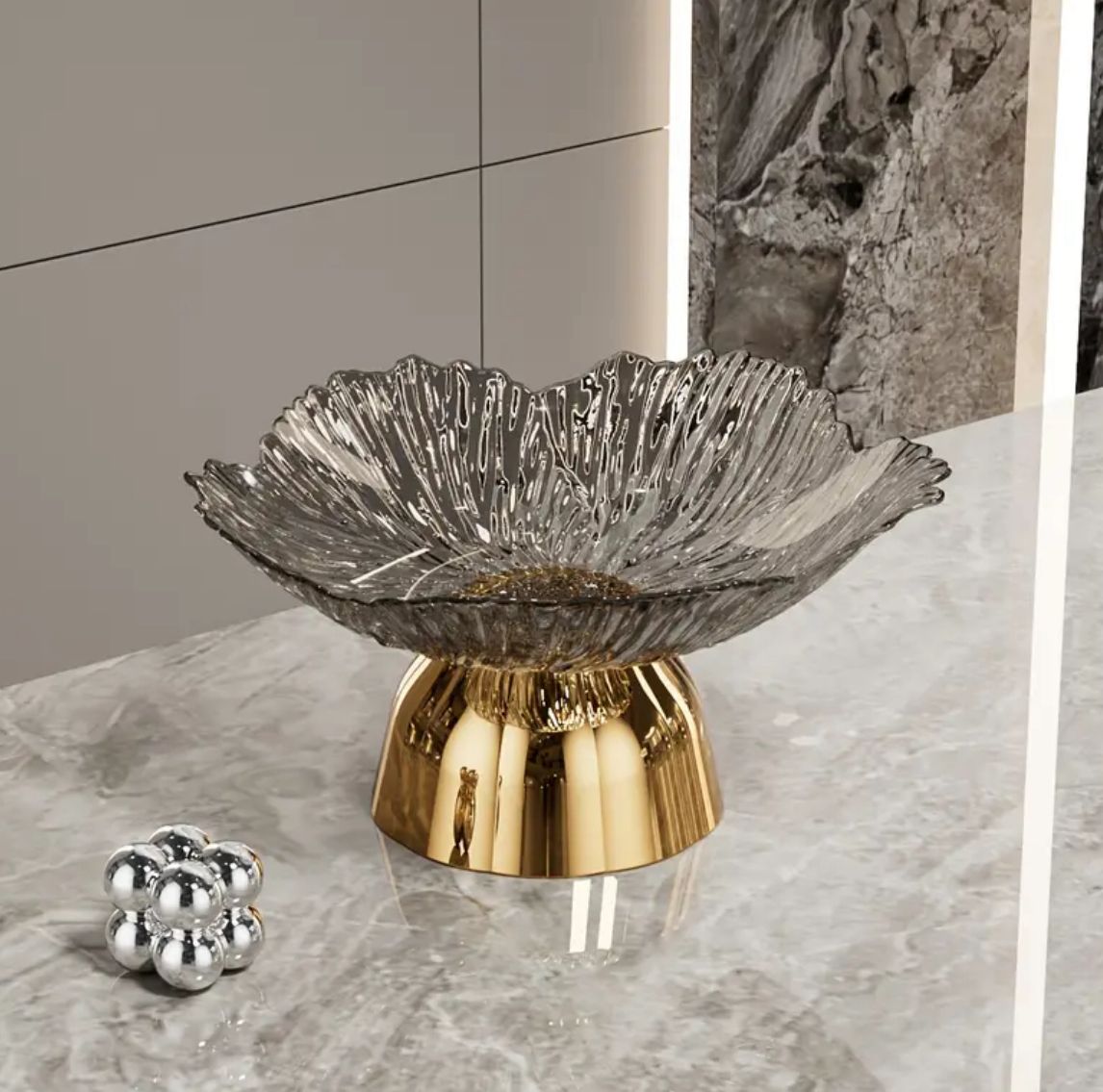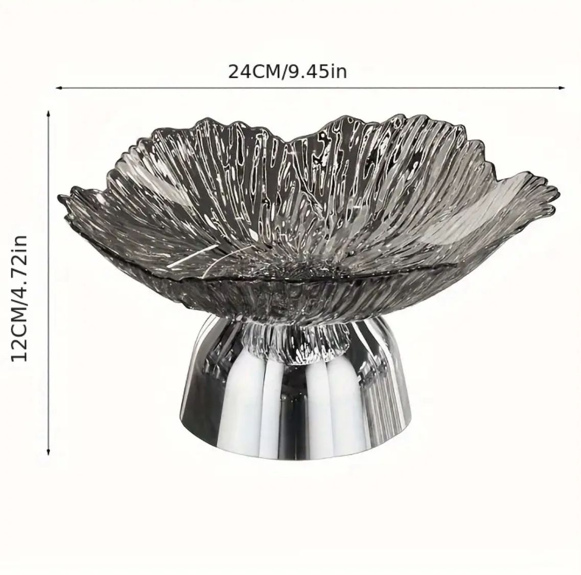 Šios išskirtinio dizaino stiklinės serviravimo lėkštės – tikra stalo puošmena. Raudono arba pilko stiklo žiedlapio formos viršus su spindinčiu auksiniu arba sidabriniu pagrindu sukuria prabangų ir šventinį įspūdį.