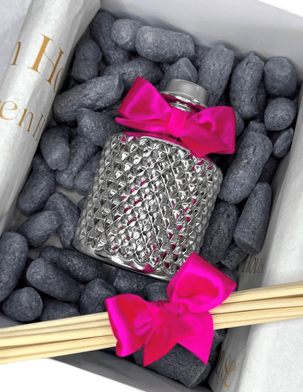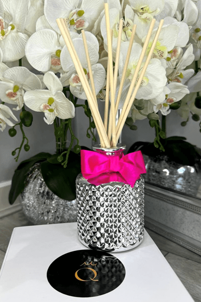 This reed diffuser showcases a truly luxurious design, diamond-patterned glass bottle, setting it apart from conventional diffusers. The intricate diamond texture adds a tactile and visual element of sophistication, making it not only functional but also a statement piece in any home. Tied with a satin bow, this diffuser exudes elegance and attention to detail, elevating the aesthetic of any space it occupies.