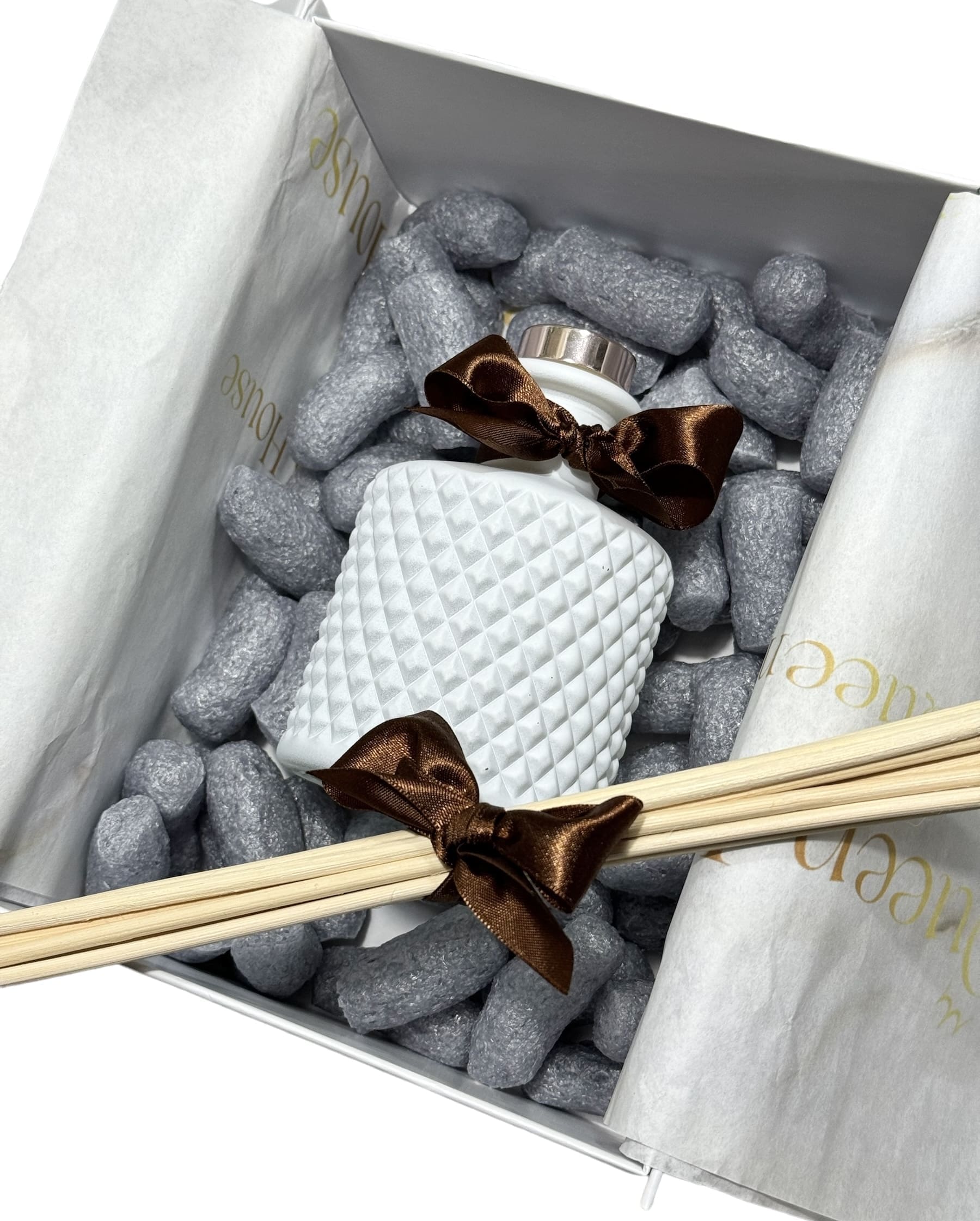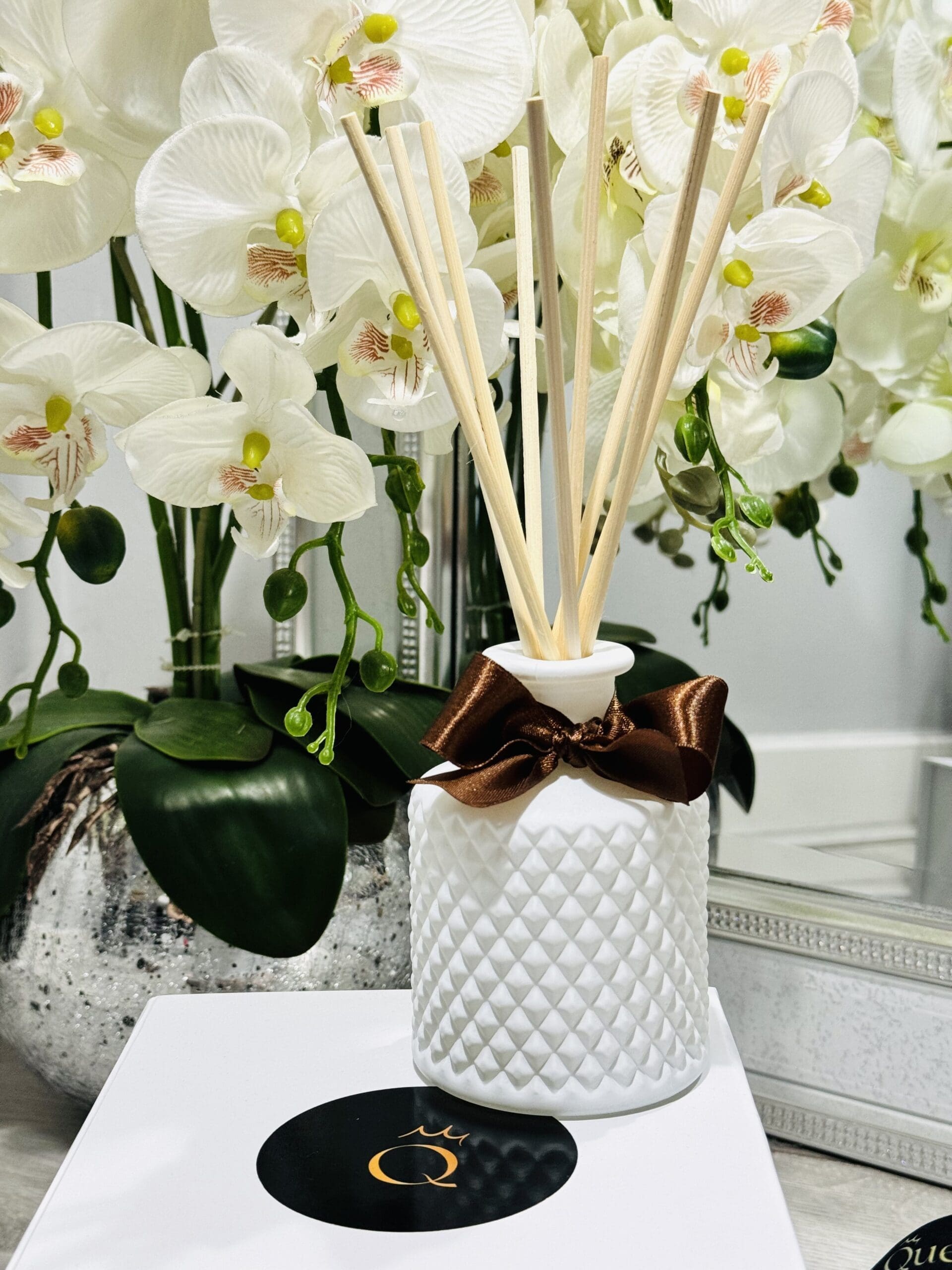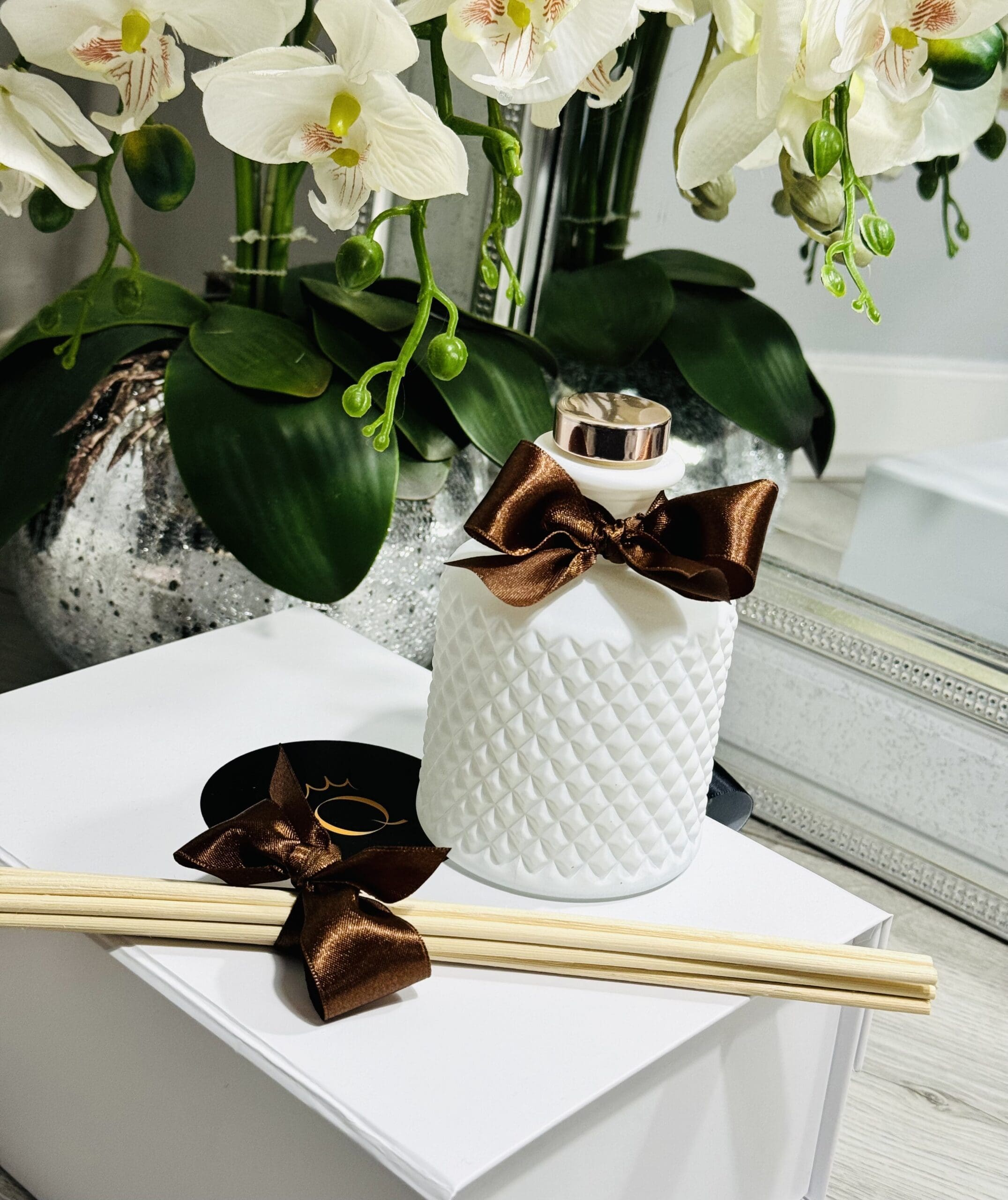 This reed diffuser showcases a truly luxurious design, diamond-patterned glass bottle, setting it apart from conventional diffusers. The intricate diamond texture adds a tactile and visual element of sophistication, making it not only functional but also a statement piece in any home. Tied with a satin bow, this diffuser exudes elegance and attention to detail, elevating the aesthetic of any space it occupies.
