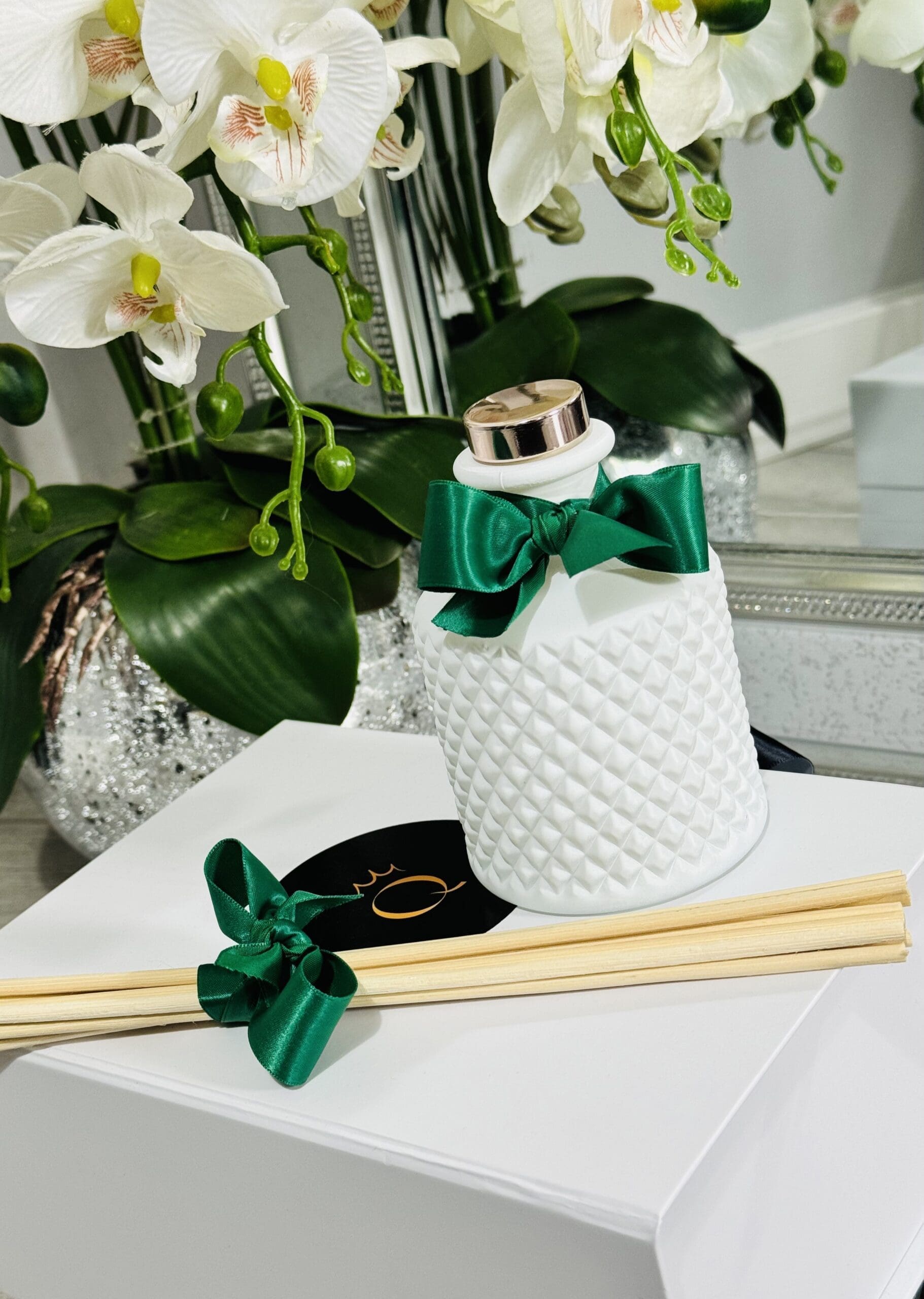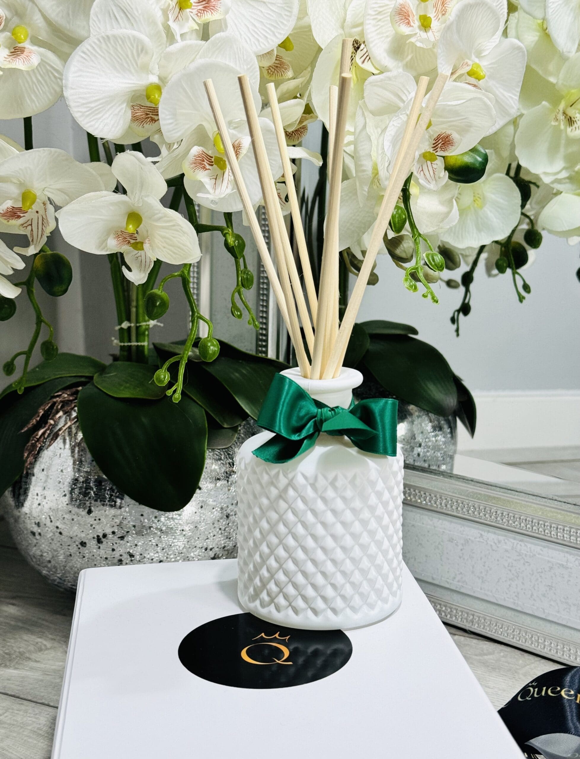 This reed diffuser showcases a truly luxurious design, diamond-patterned glass bottle, setting it apart from conventional diffusers. The intricate diamond texture adds a tactile and visual element of sophistication, making it not only functional but also a statement piece in any home. Tied with a satin bow, this diffuser exudes elegance and attention to detail, elevating the aesthetic of any space it occupies.