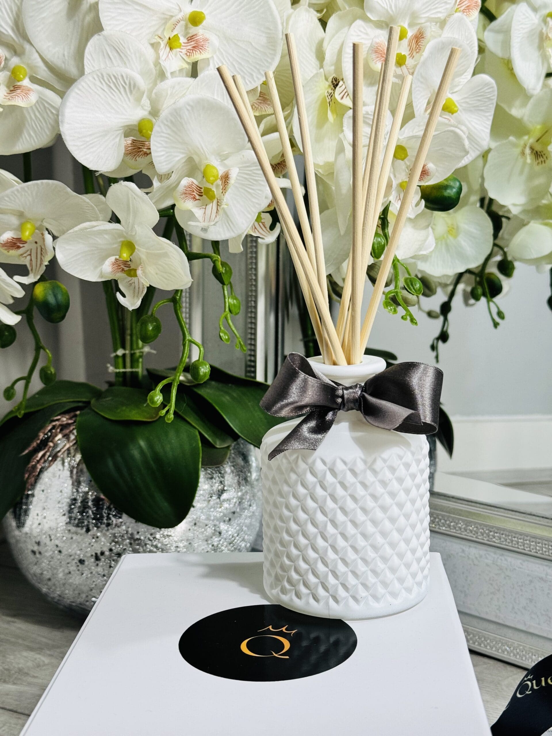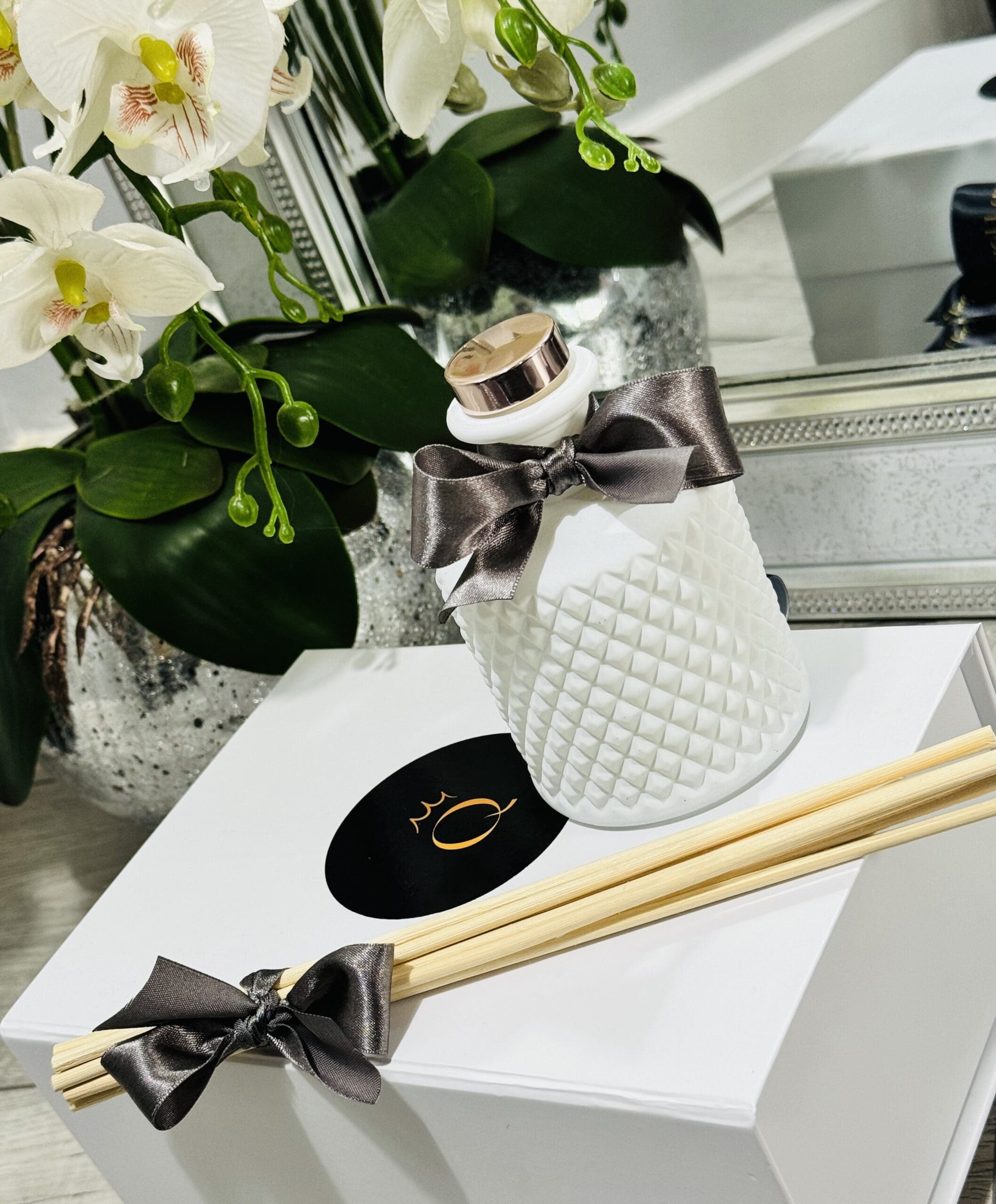This reed diffuser showcases a truly luxurious design, diamond-patterned glass bottle, setting it apart from conventional diffusers. The intricate diamond texture adds a tactile and visual element of sophistication, making it not only functional but also a statement piece in any home. Tied with a satin bow, this diffuser exudes elegance and attention to detail, elevating the aesthetic of any space it occupies.