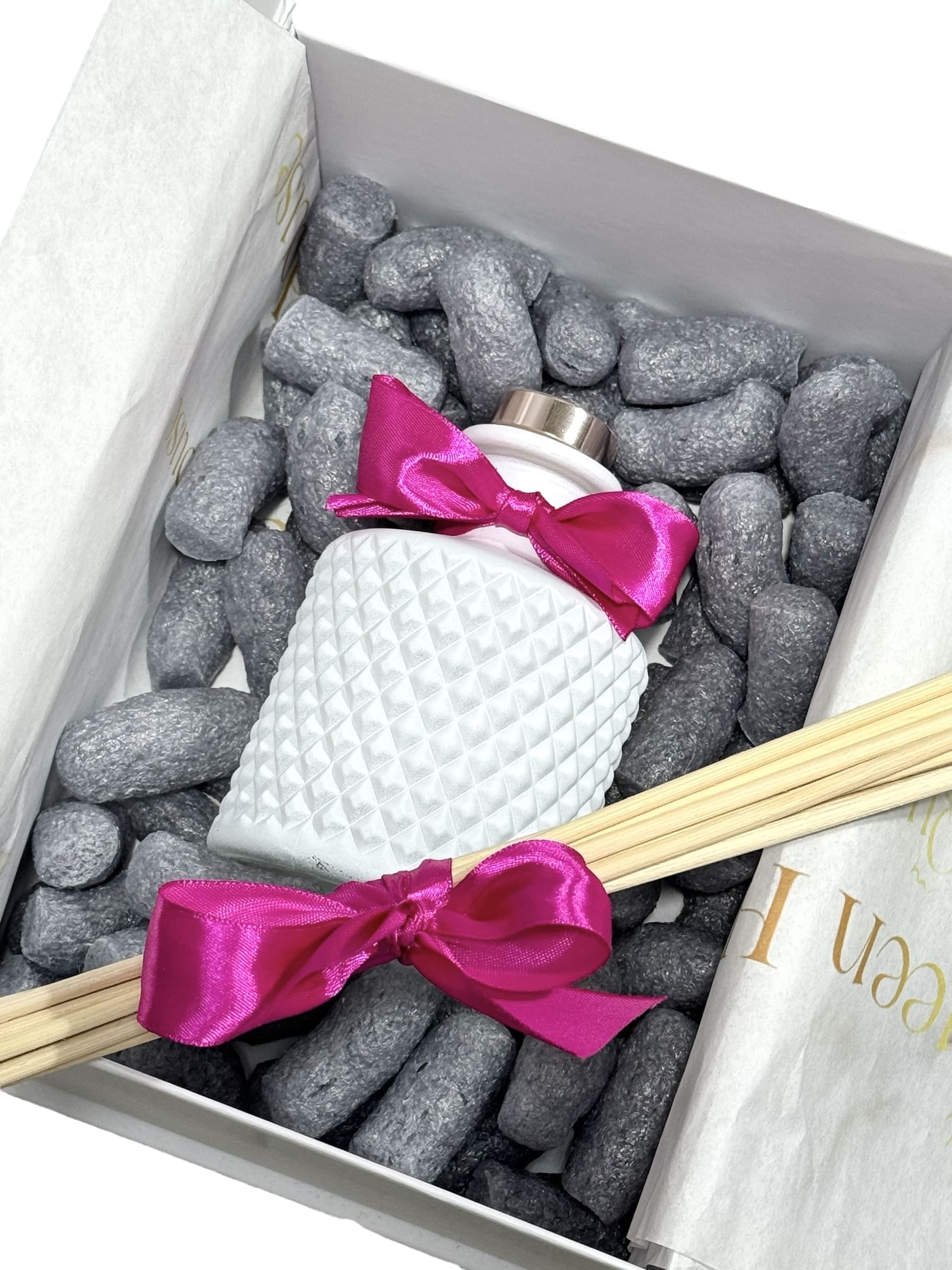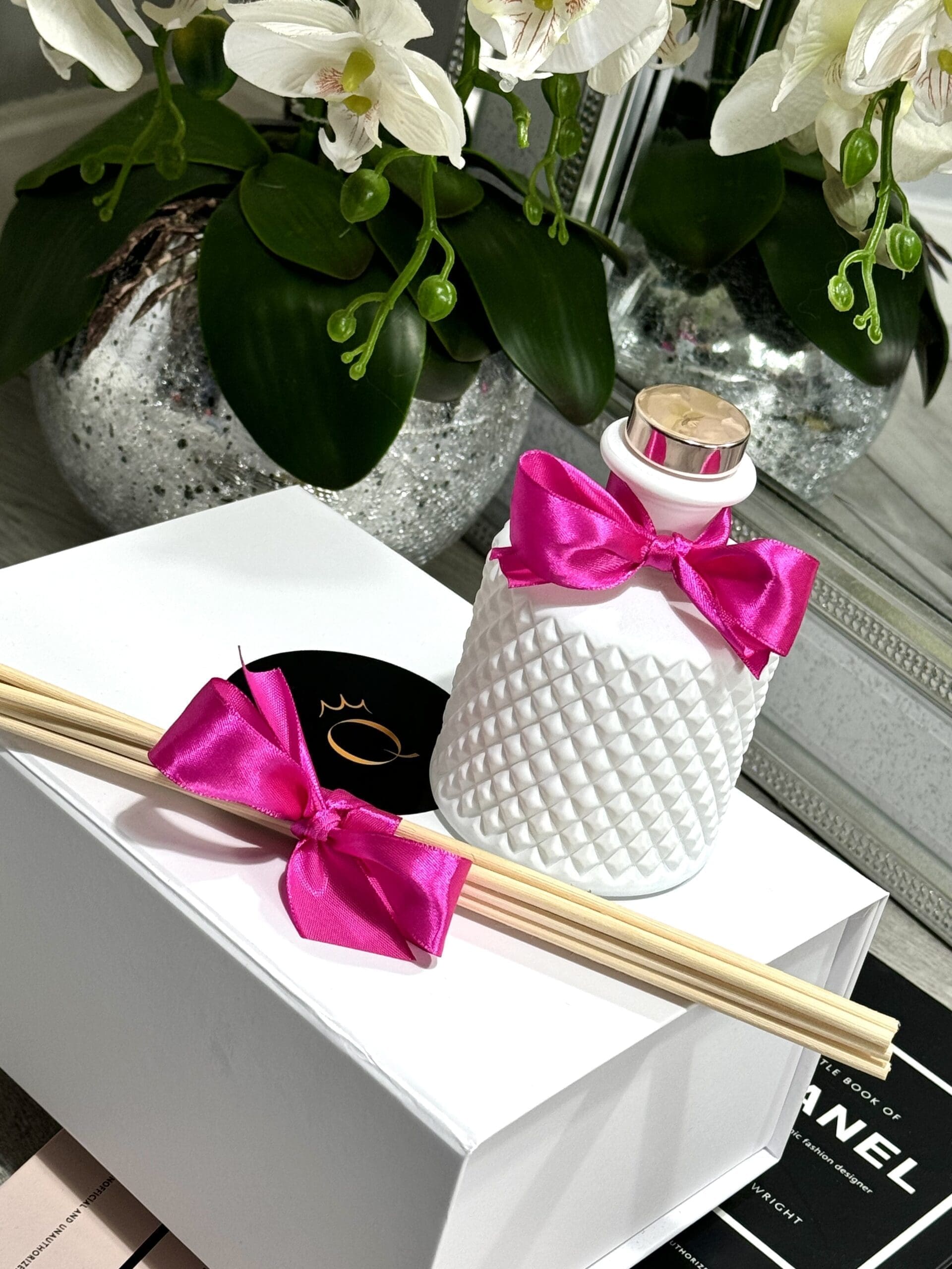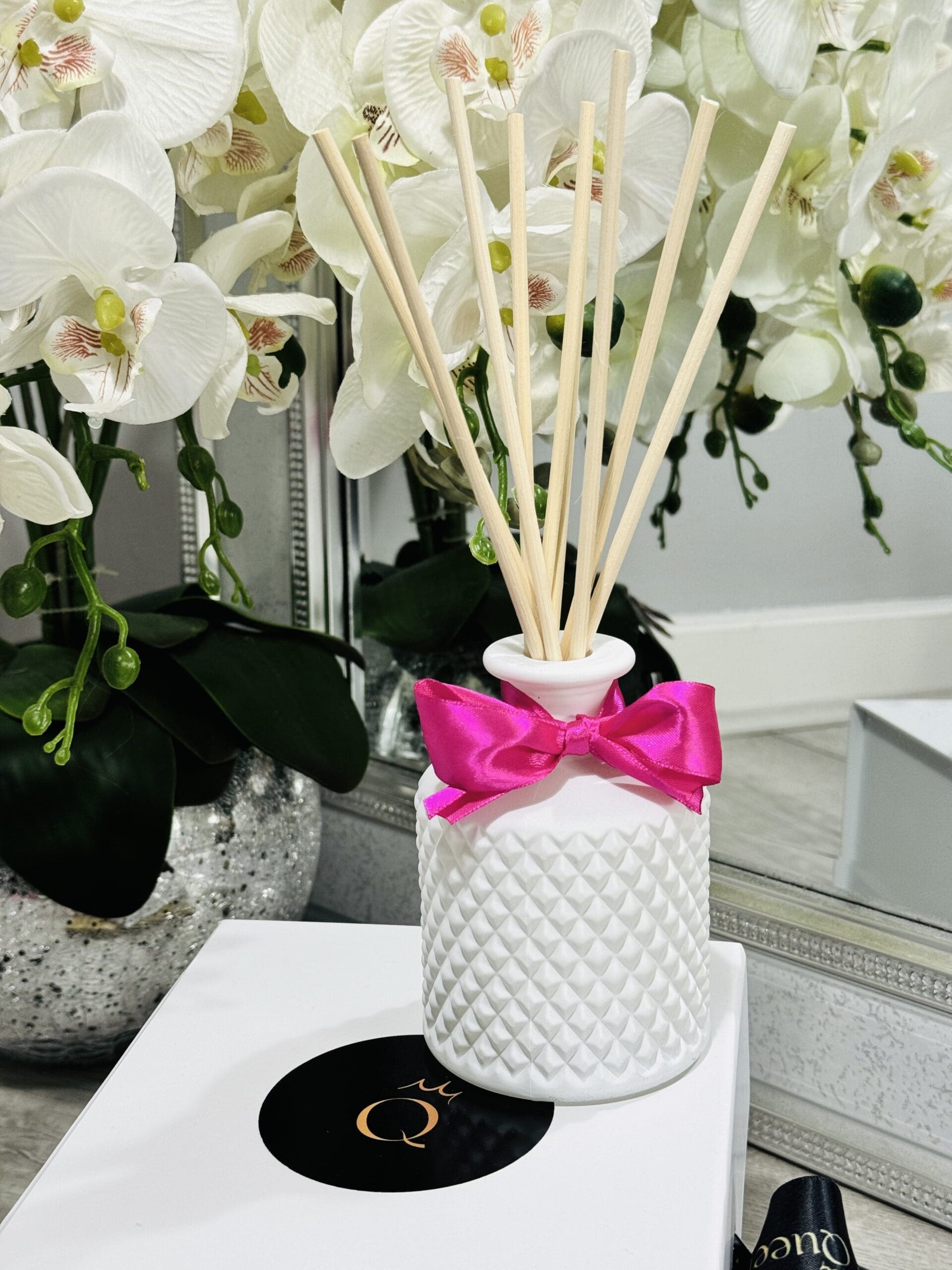 This reed diffuser showcases a truly luxurious design, diamond-patterned glass bottle, setting it apart from conventional diffusers. The intricate diamond texture adds a tactile and visual element of sophistication, making it not only functional but also a statement piece in any home. Tied with a satin bow, this diffuser exudes elegance and attention to detail, elevating the aesthetic of any space it occupies.