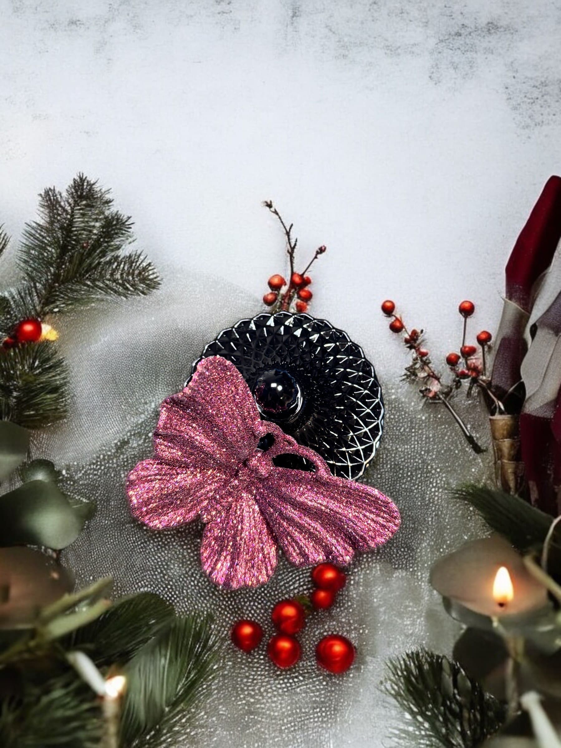 The Diamond Queen candle showcases a bold and unique design, ideal for adding a luxurious touch to any festive decor. Its deep black, diamond-patterned glass exudes sophistication, while the lid is adorned with a sparkling wine butterfly that adds a vibrant, festive flair. This elegant candle not only fills your home with warmth and a delightful fragrance but also serves as a stylish decorative piece, making it perfect for creating a magical holiday ambiance.