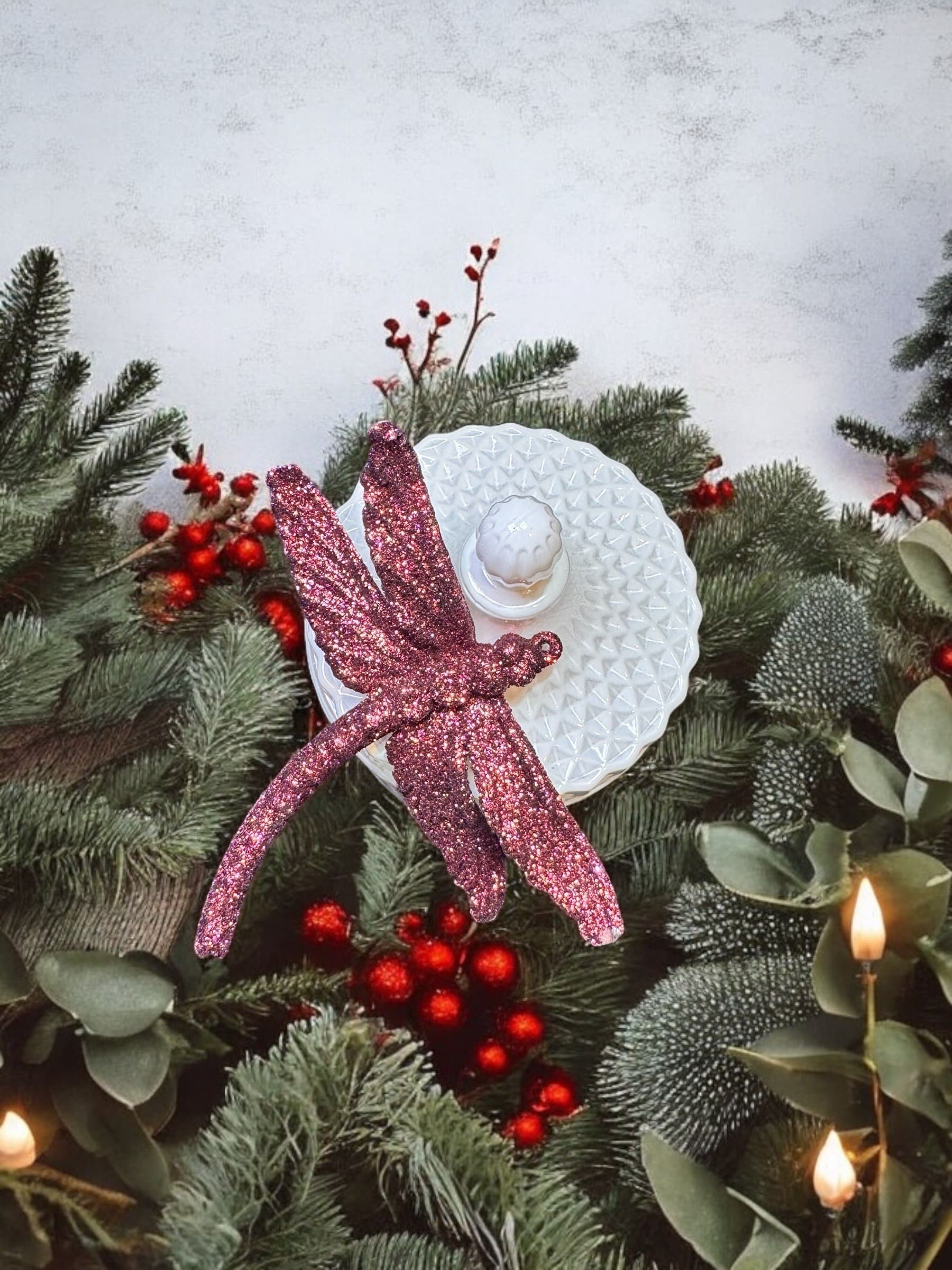 The Diamond Queen candle presents a unique and enchanting design, perfect for the festive season. Its elegant white, diamond-patterned glass jar brings a touch of winter elegance, while the lid is adorned with a sparkling red wine dragonfly detail, adding a festive and vibrant charm. This luxurious candle not only fills your space with warmth and fragrance but also serves as a captivating Christmas decor piece, making it a stylish addition to any holiday setting and creating a magical seasonal ambiance.