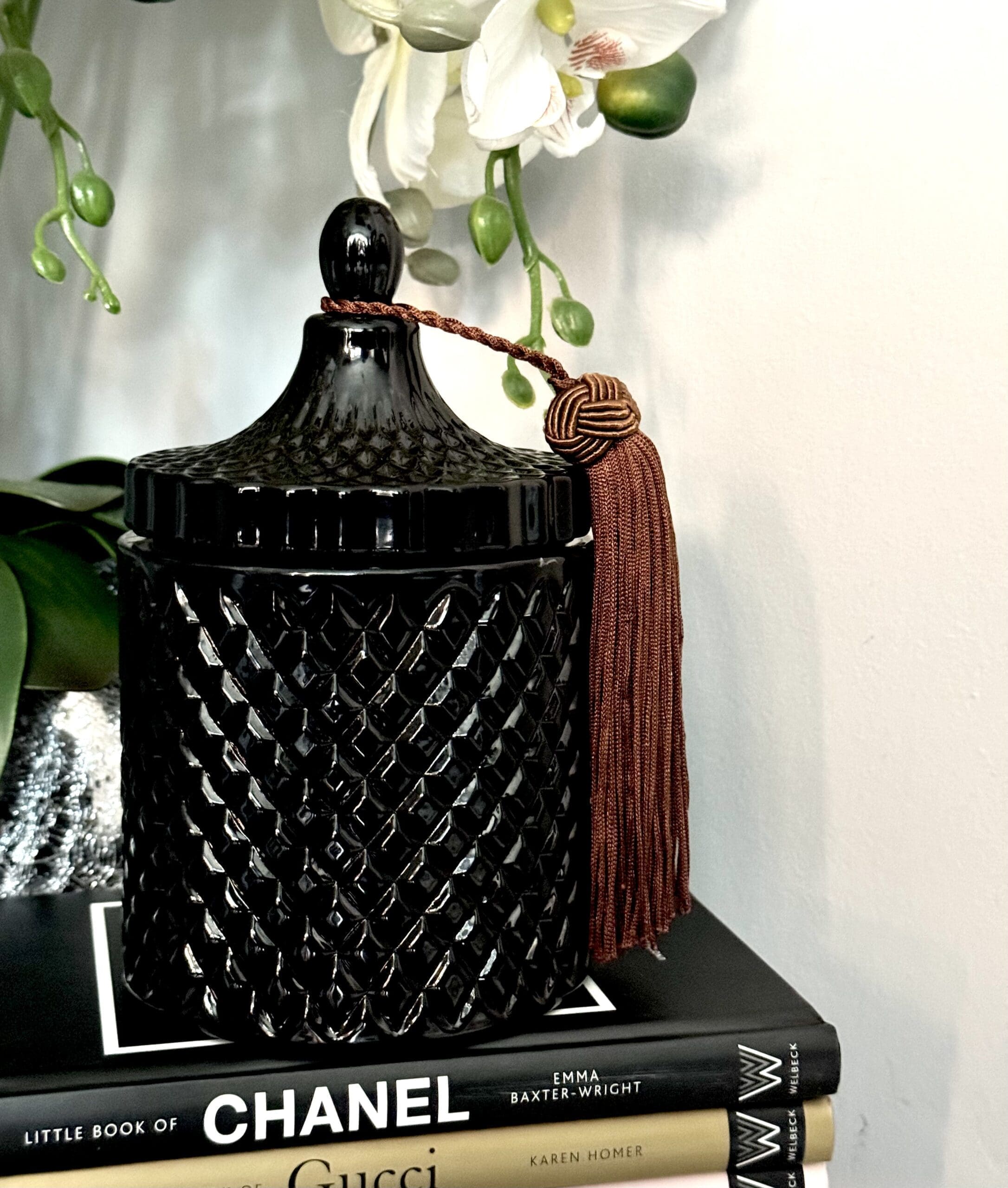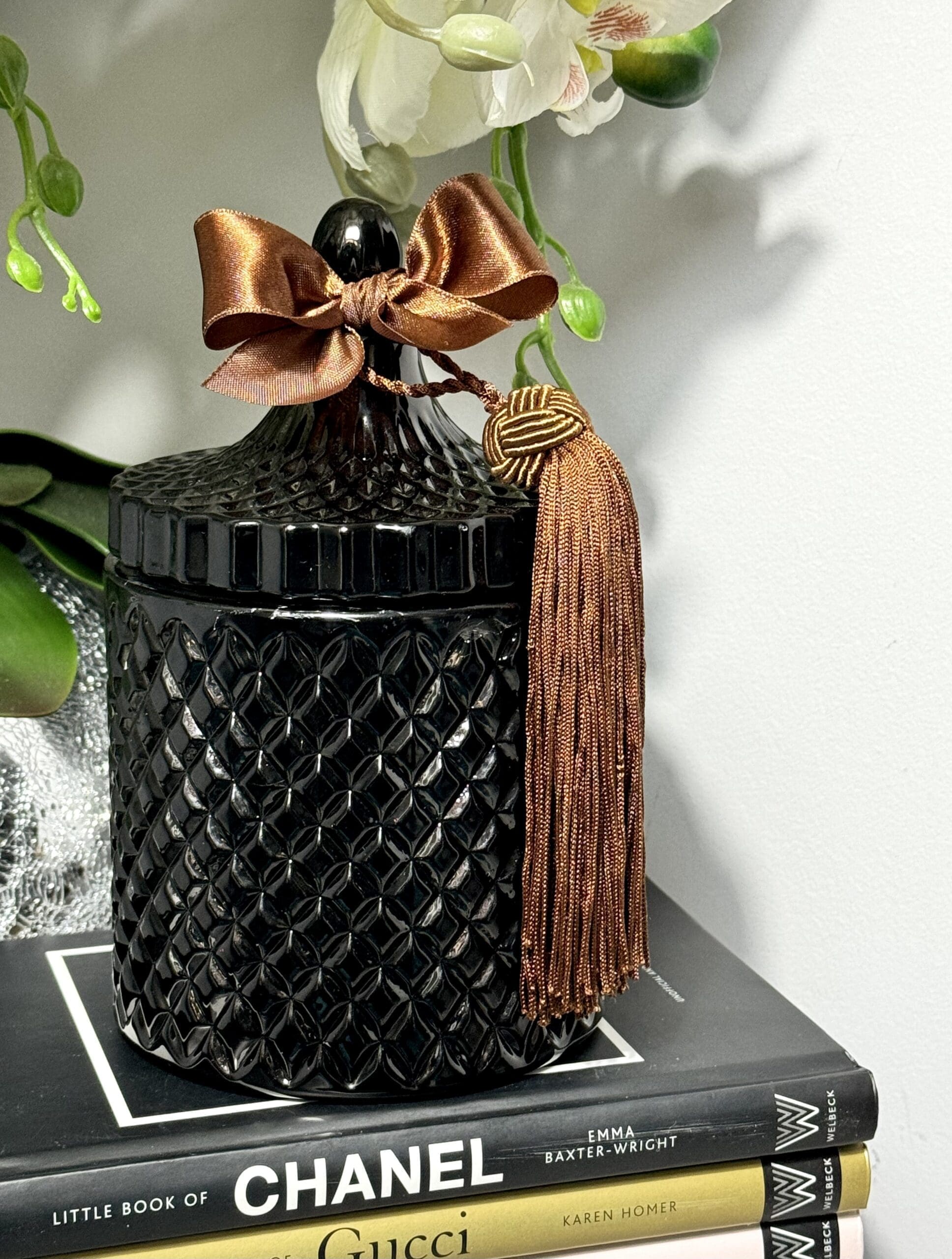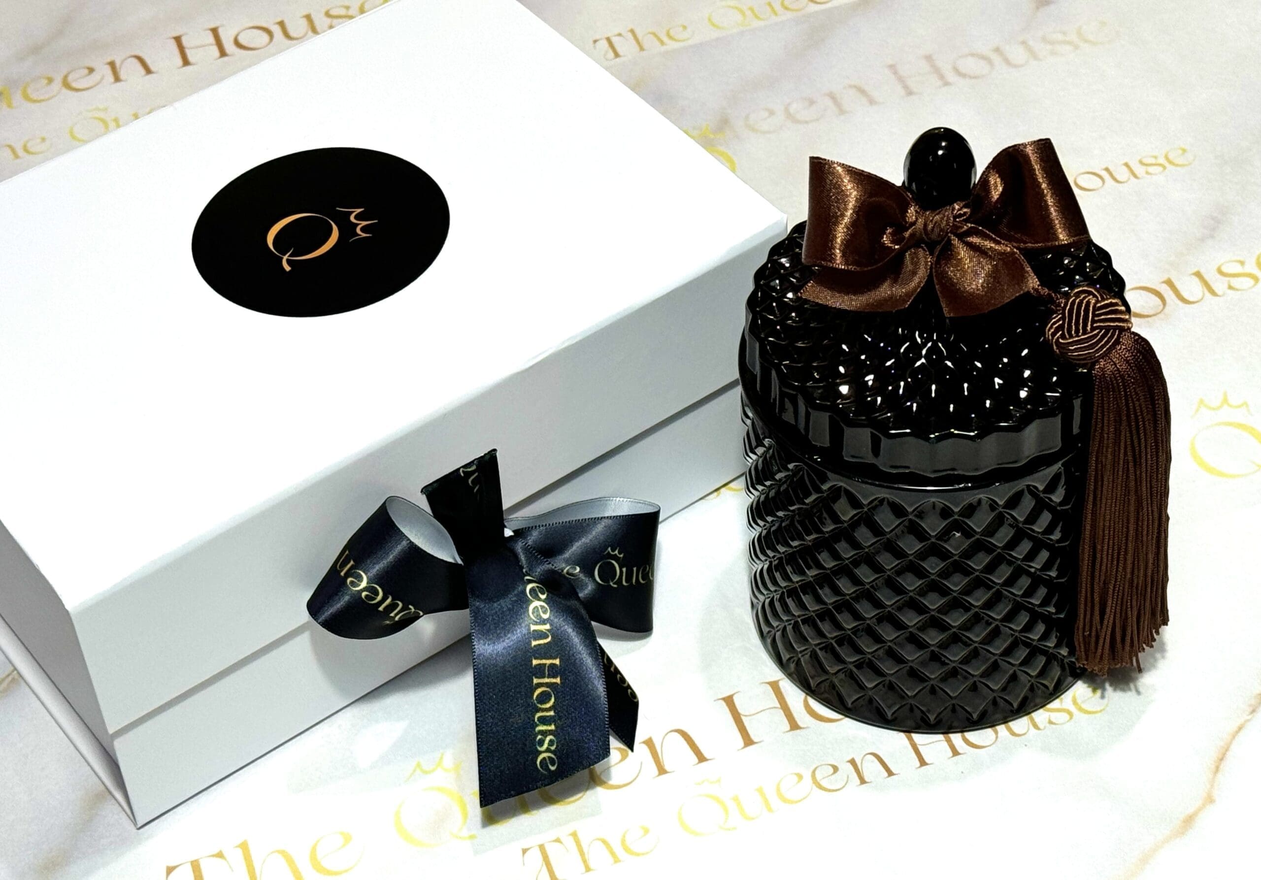 Diamond Queen candle, weighing 650 grams, features an intricately designed glass container with a texture diamond pattern. The lid, which mirrors the container’s elegant design, is topped with a decorative finial and adorned with a vibrant satin bow. A matching tassel adds a touch of luxury, hanging gracefully from the bow. This sophisticated candle is a perfect addition to any stylish home décor, especially those with a contemporary or luxurious theme. The container’s rich texture and striking embellishments make it a standout decorative piece, suitable for display in any room.