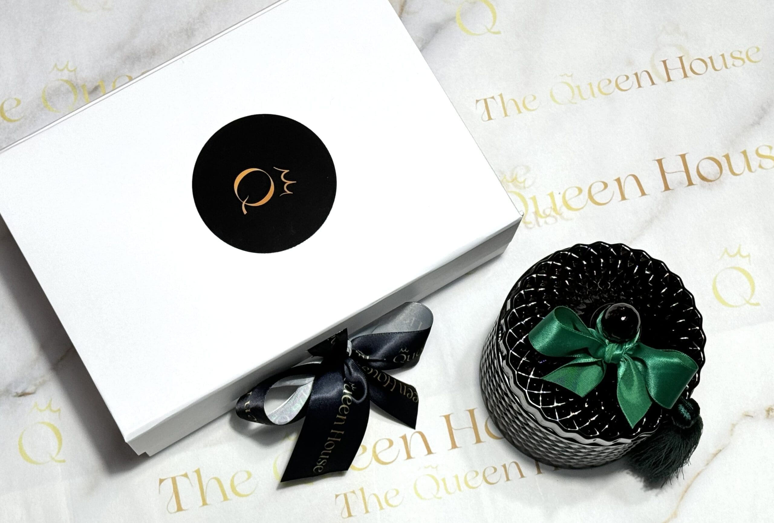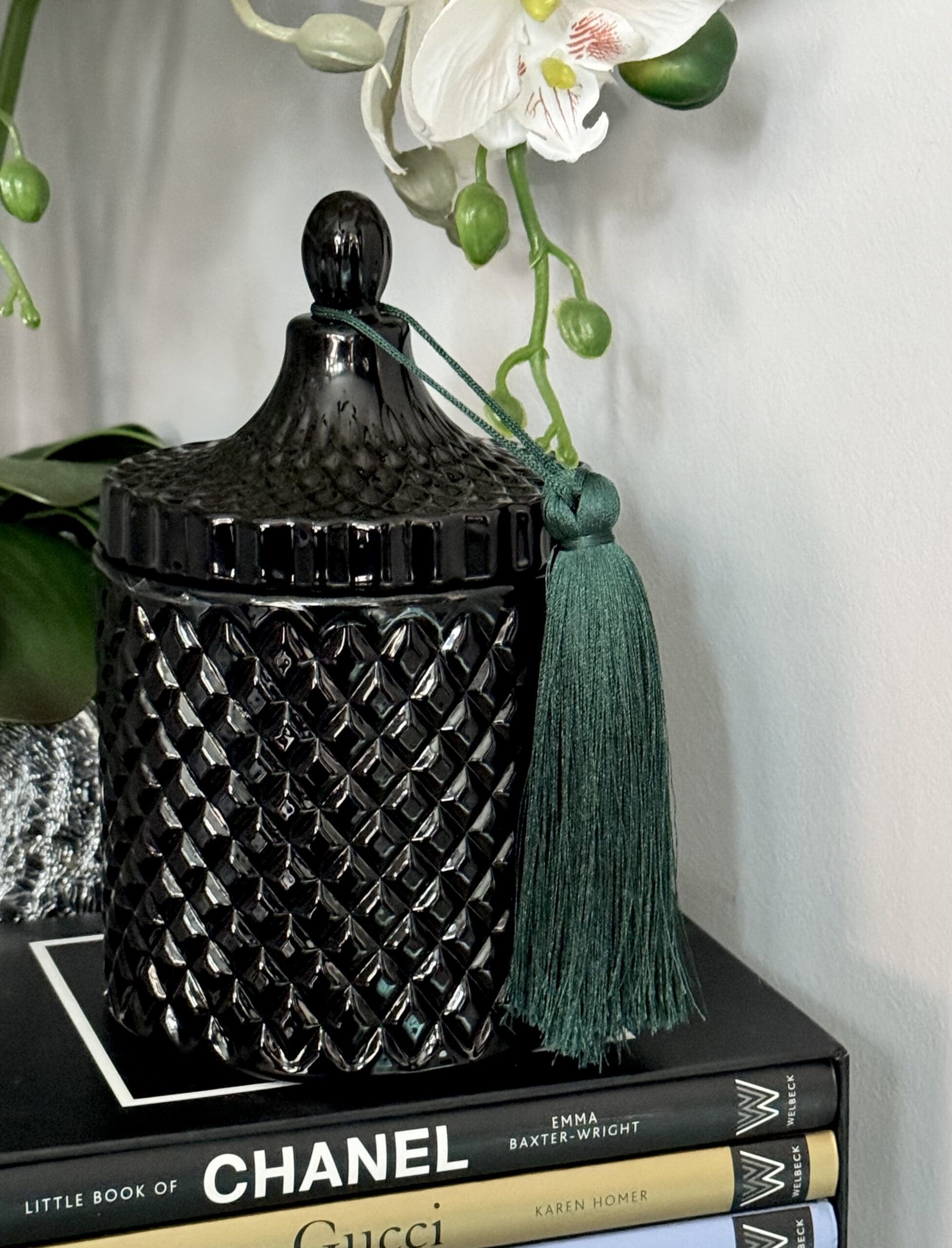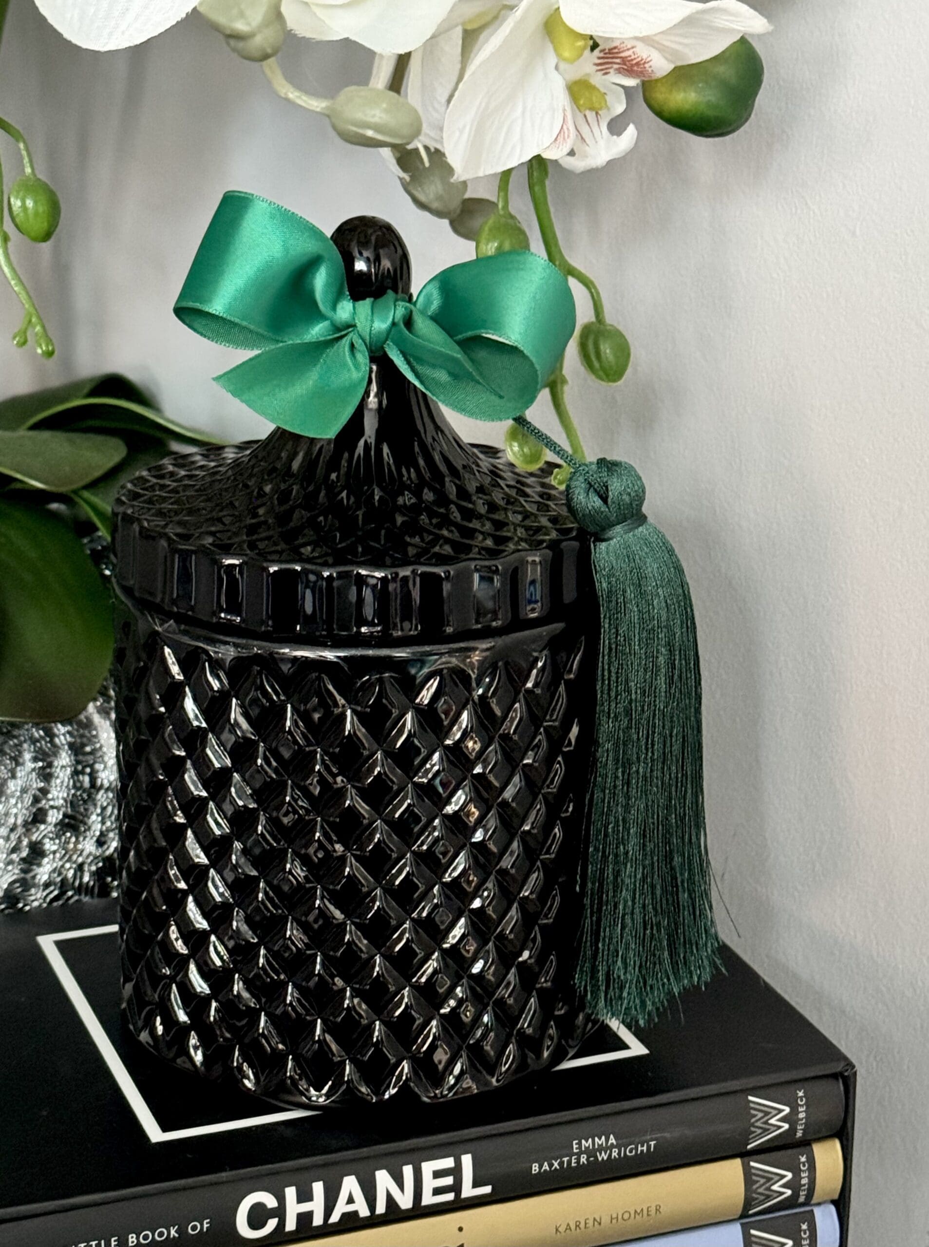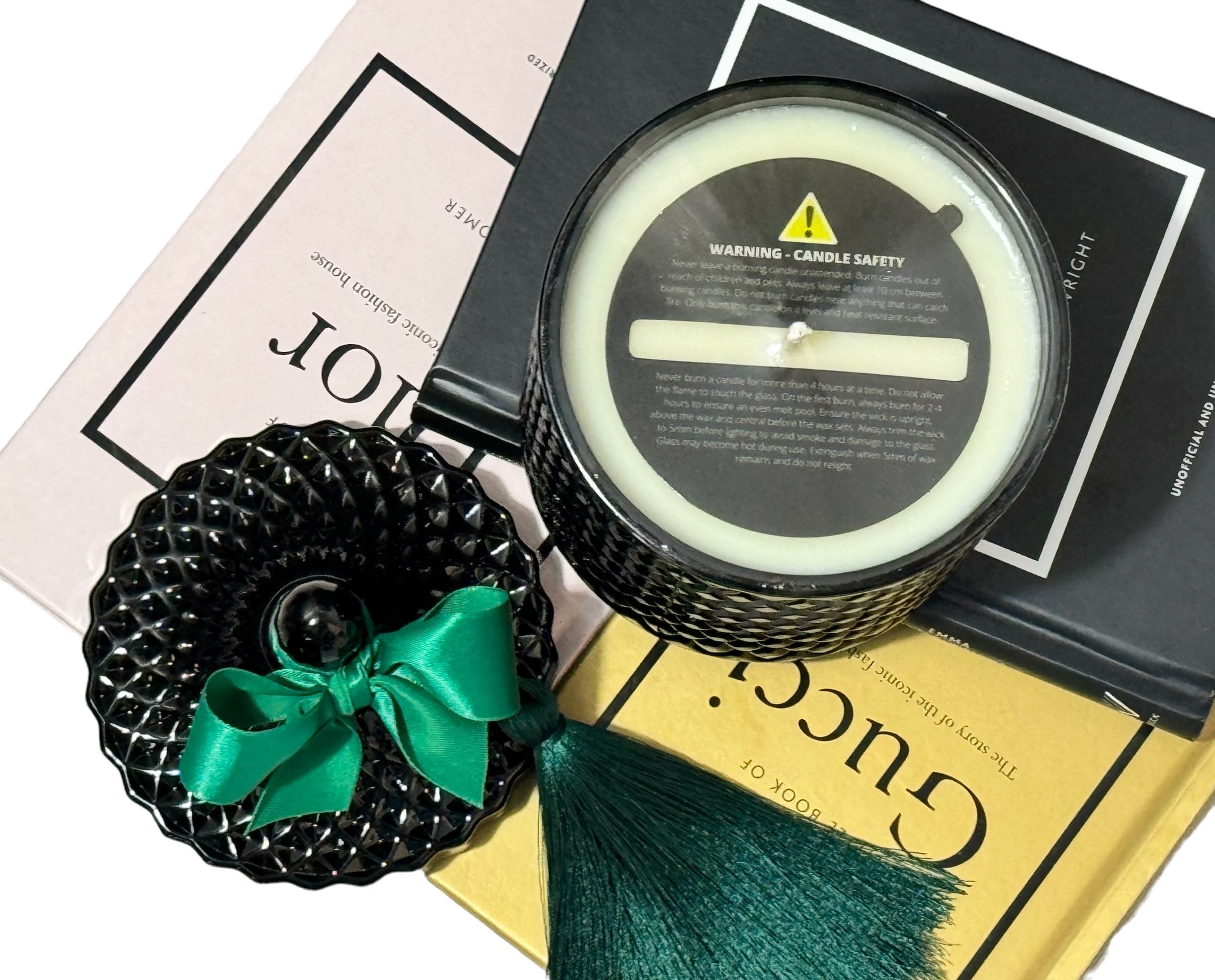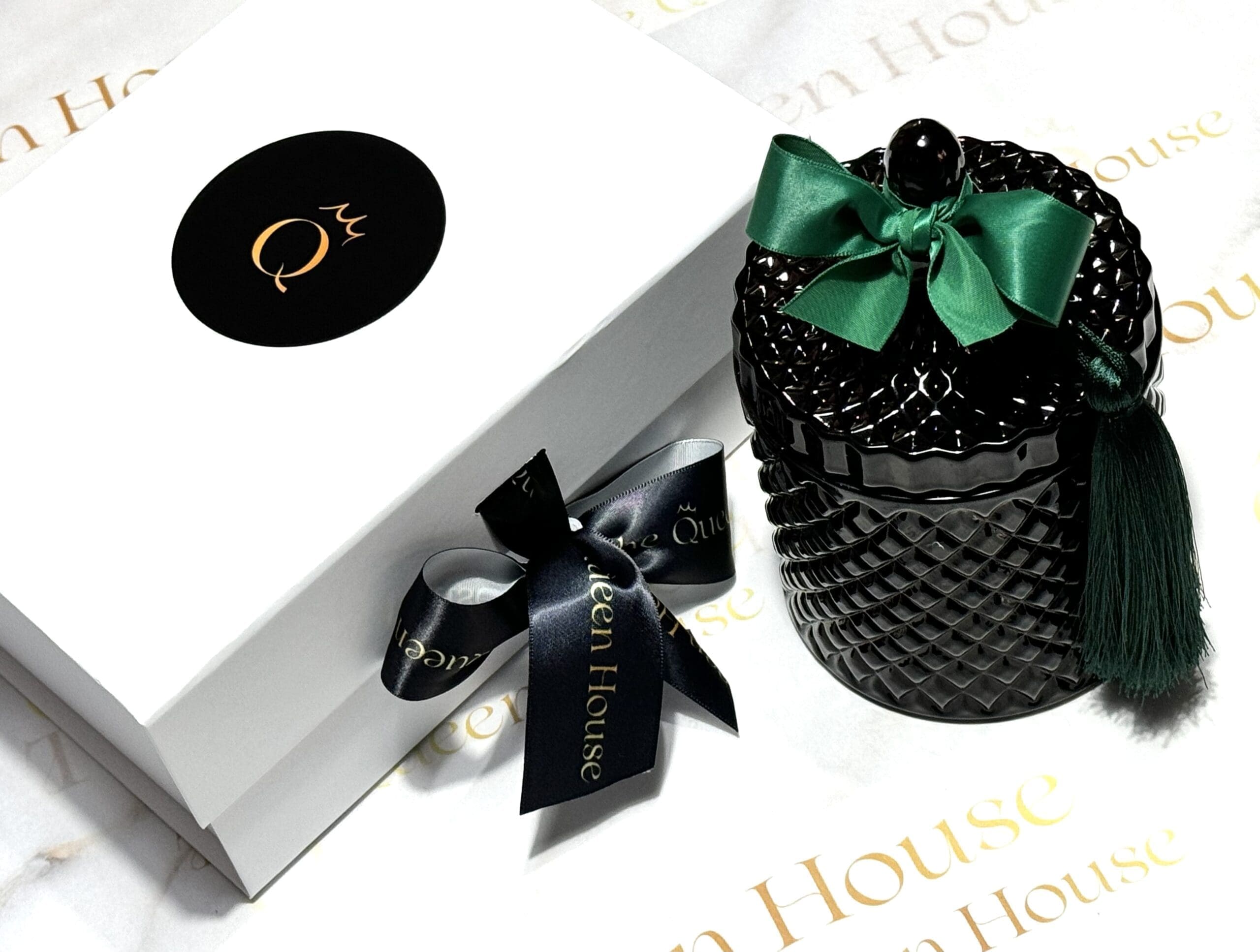 Diamond Queen candle, weighing 650 grams, features an intricately designed glass container with a texture diamond pattern. The lid, which mirrors the container’s elegant design, is topped with a decorative finial and adorned with a vibrant satin bow. A matching tassel adds a touch of luxury, hanging gracefully from the bow. This sophisticated candle is a perfect addition to any stylish home décor, especially those with a contemporary or luxurious theme. The container’s rich texture and striking embellishments make it a standout decorative piece, suitable for display in any room.