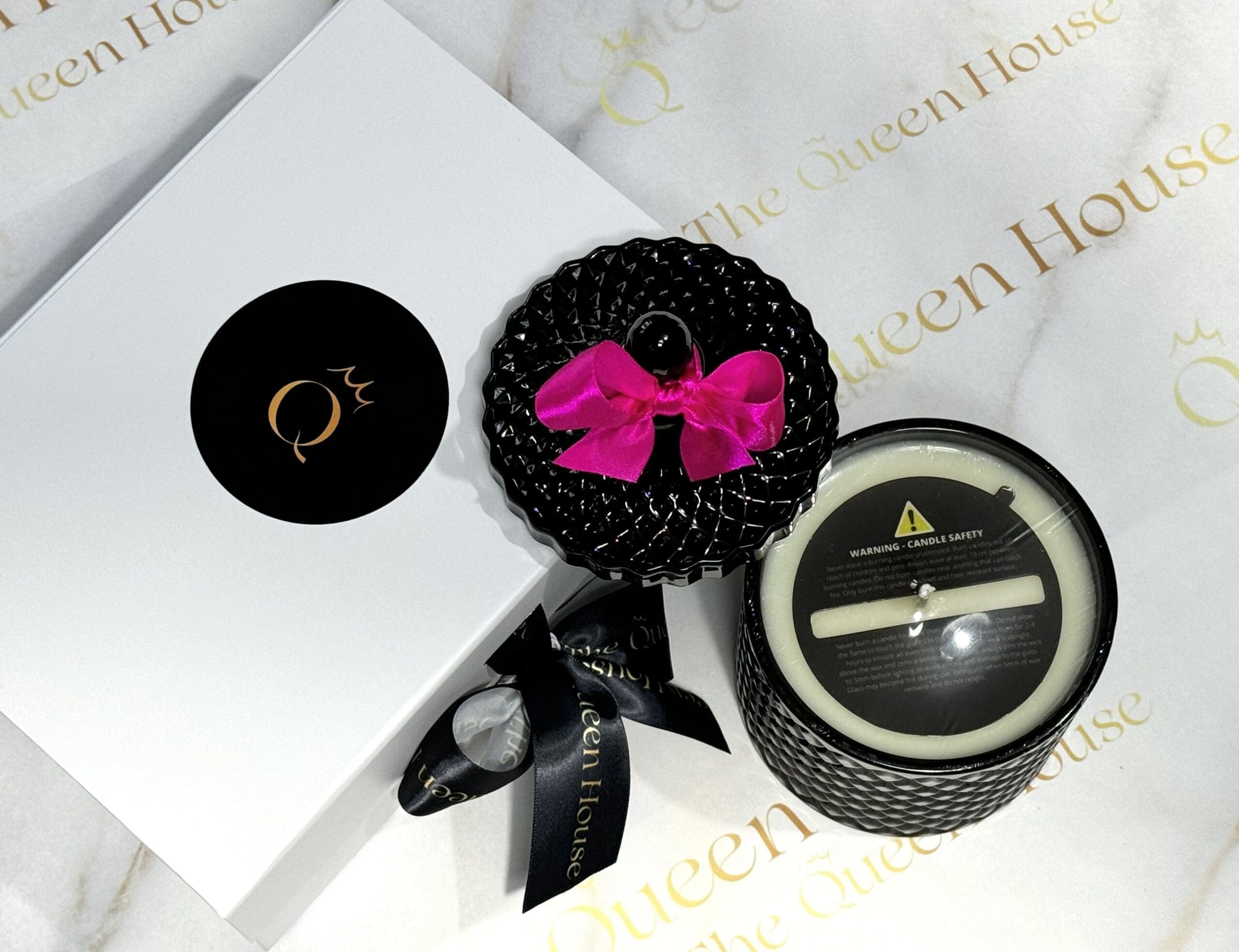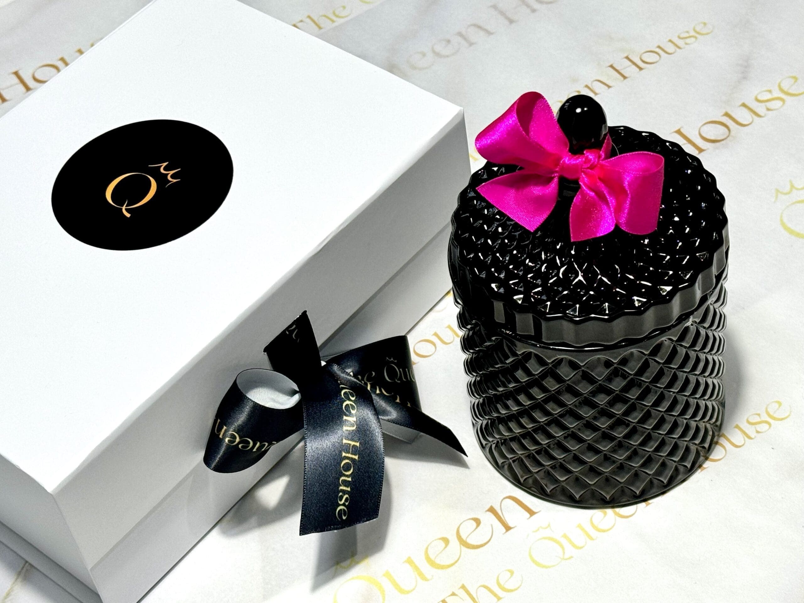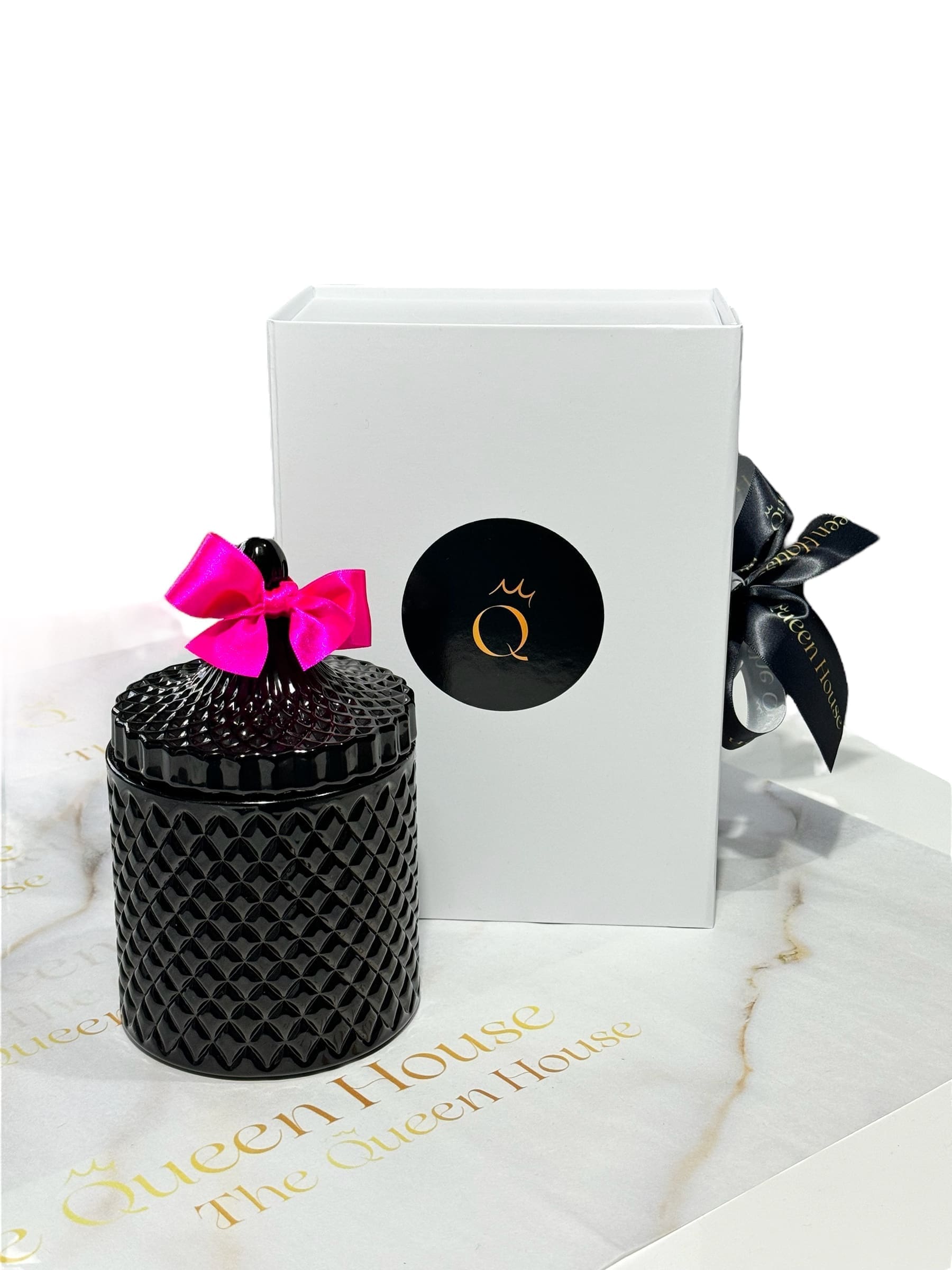 Diamond Queen candle, weighing 650 grams, features an intricately designed glass container with a texture diamond pattern. The lid, which mirrors the container’s elegant design, is topped with a decorative finial and adorned with a vibrant satin bow. A matching tassel adds a touch of luxury, hanging gracefully from the bow. This sophisticated candle is a perfect addition to any stylish home décor, especially those with a contemporary or luxurious theme. The container’s rich texture and striking embellishments make it a standout decorative piece, suitable for display in any room.