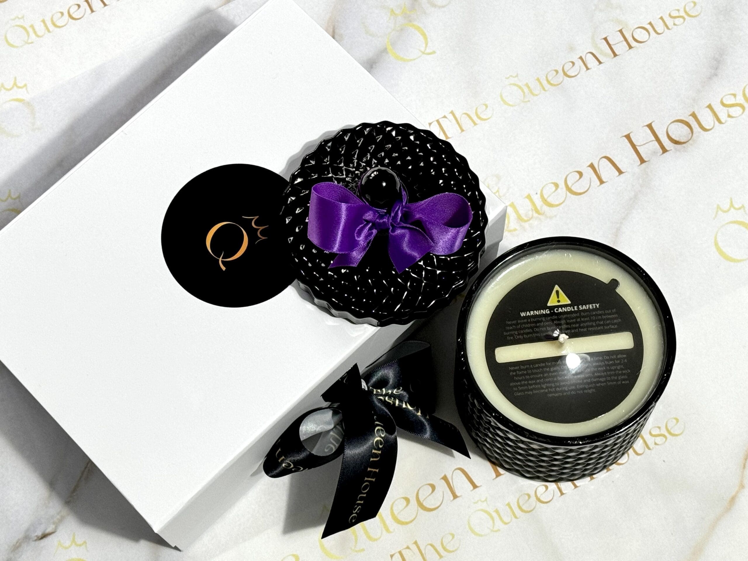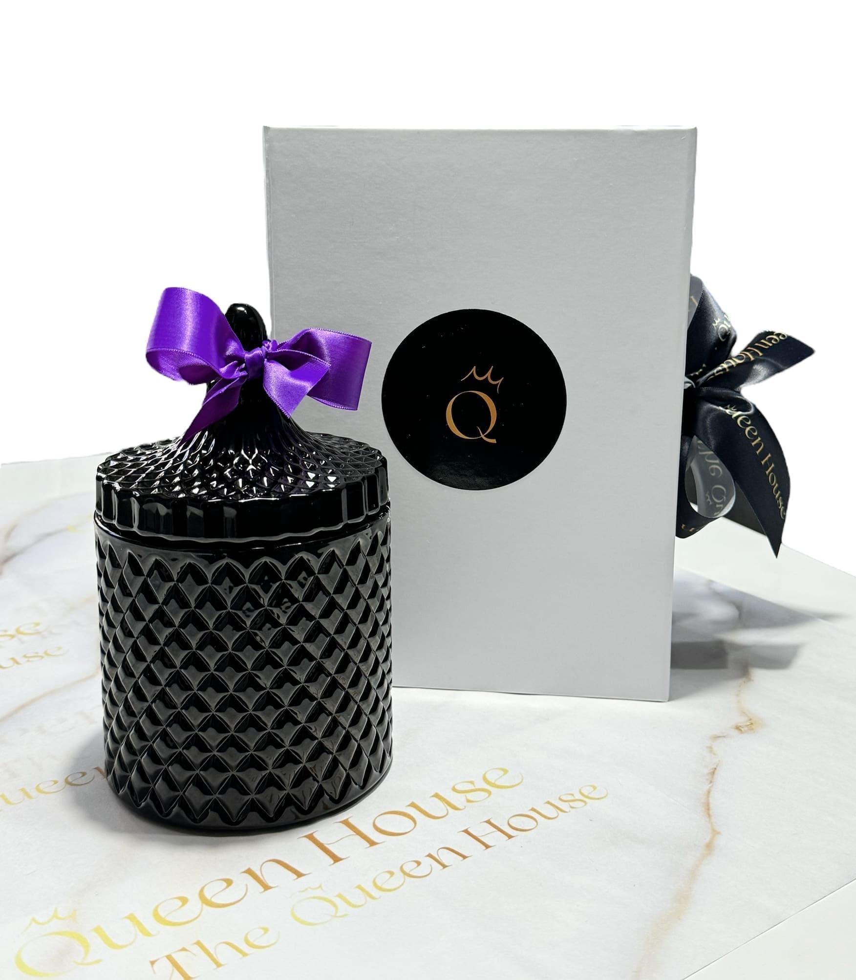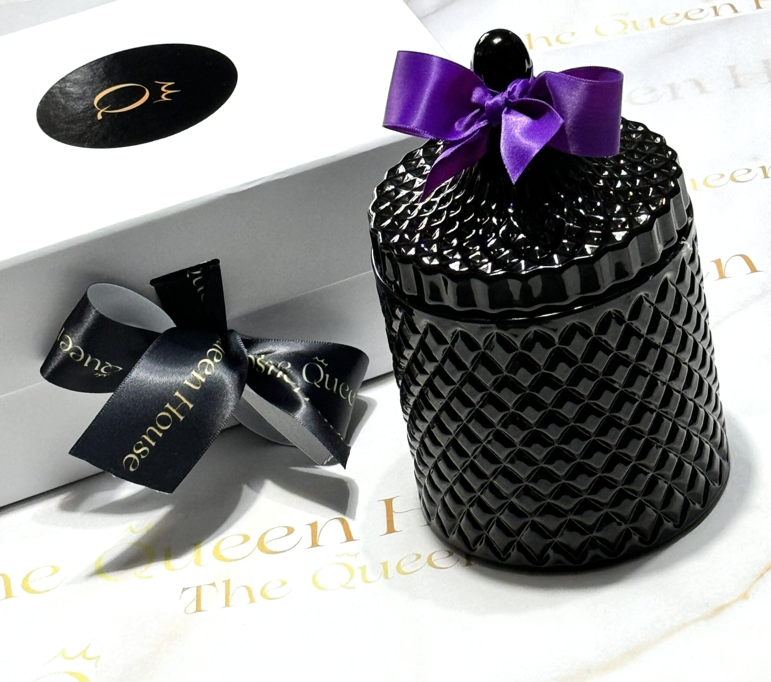 Diamond Queen candle, weighing 650 grams, features an intricately designed glass container with a texture diamond pattern. The lid, which mirrors the container’s elegant design, is topped with a decorative finial and adorned with a vibrant satin bow. A matching tassel adds a touch of luxury, hanging gracefully from the bow. This sophisticated candle is a perfect addition to any stylish home décor, especially those with a contemporary or luxurious theme. The container’s rich texture and striking embellishments make it a standout decorative piece, suitable for display in any room.