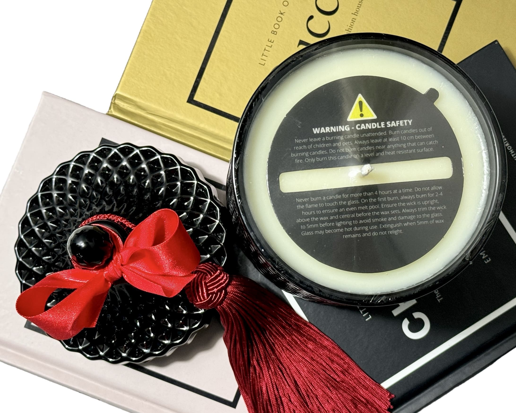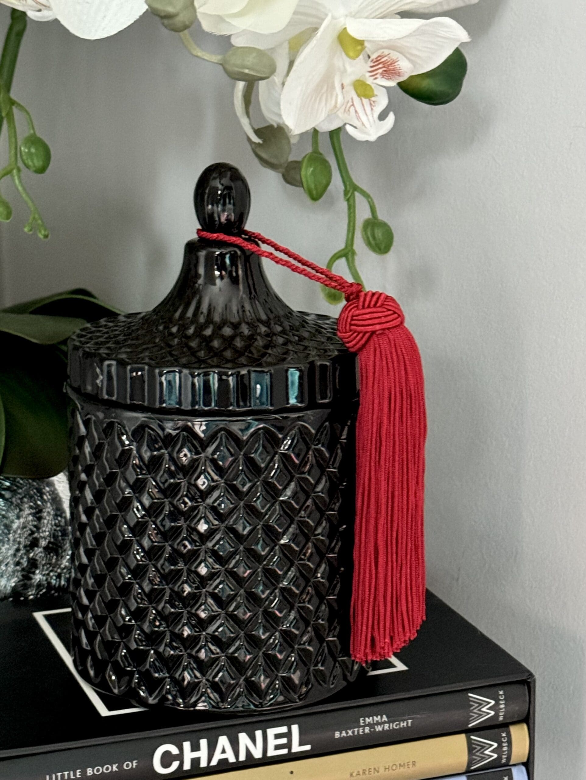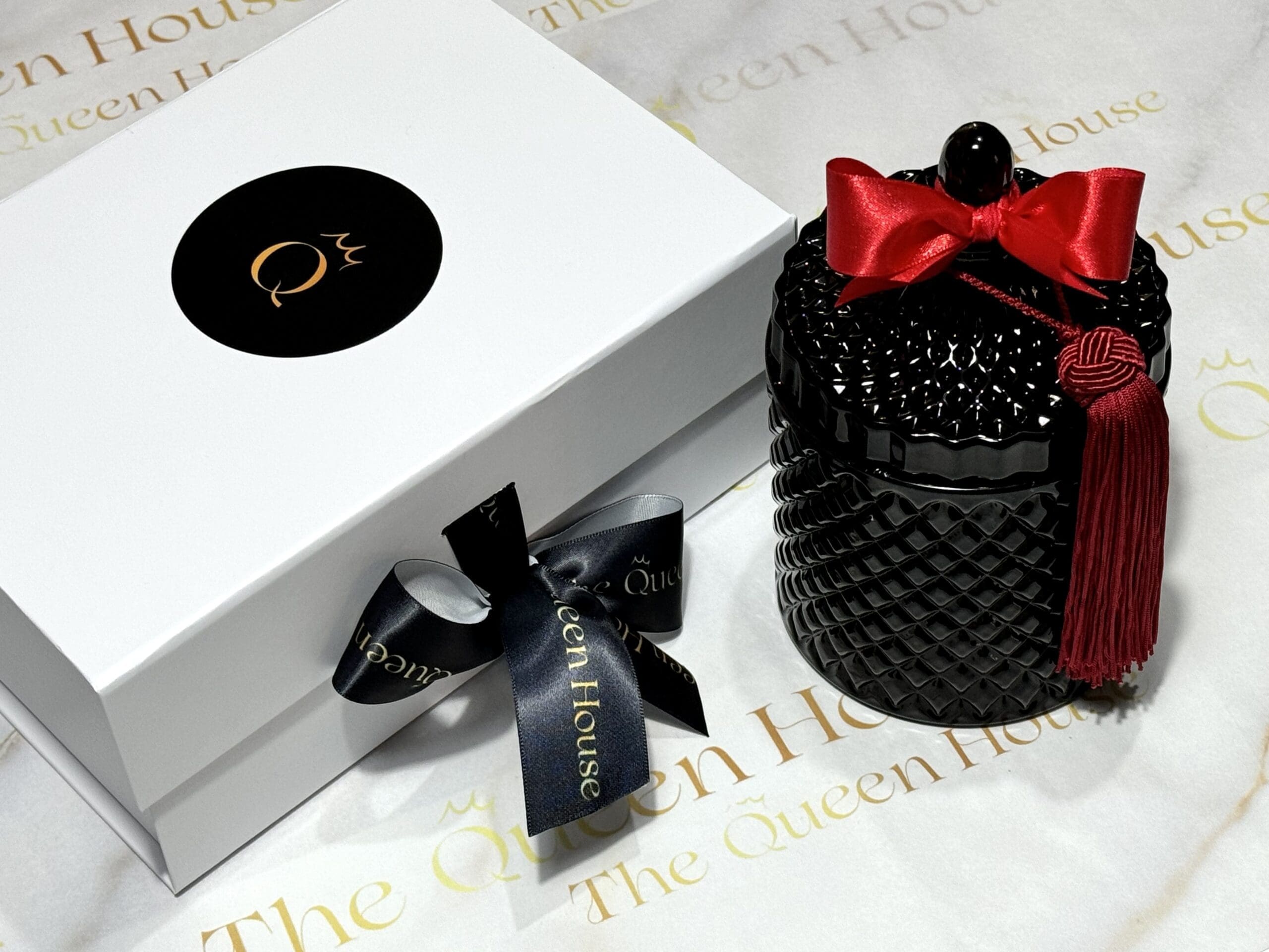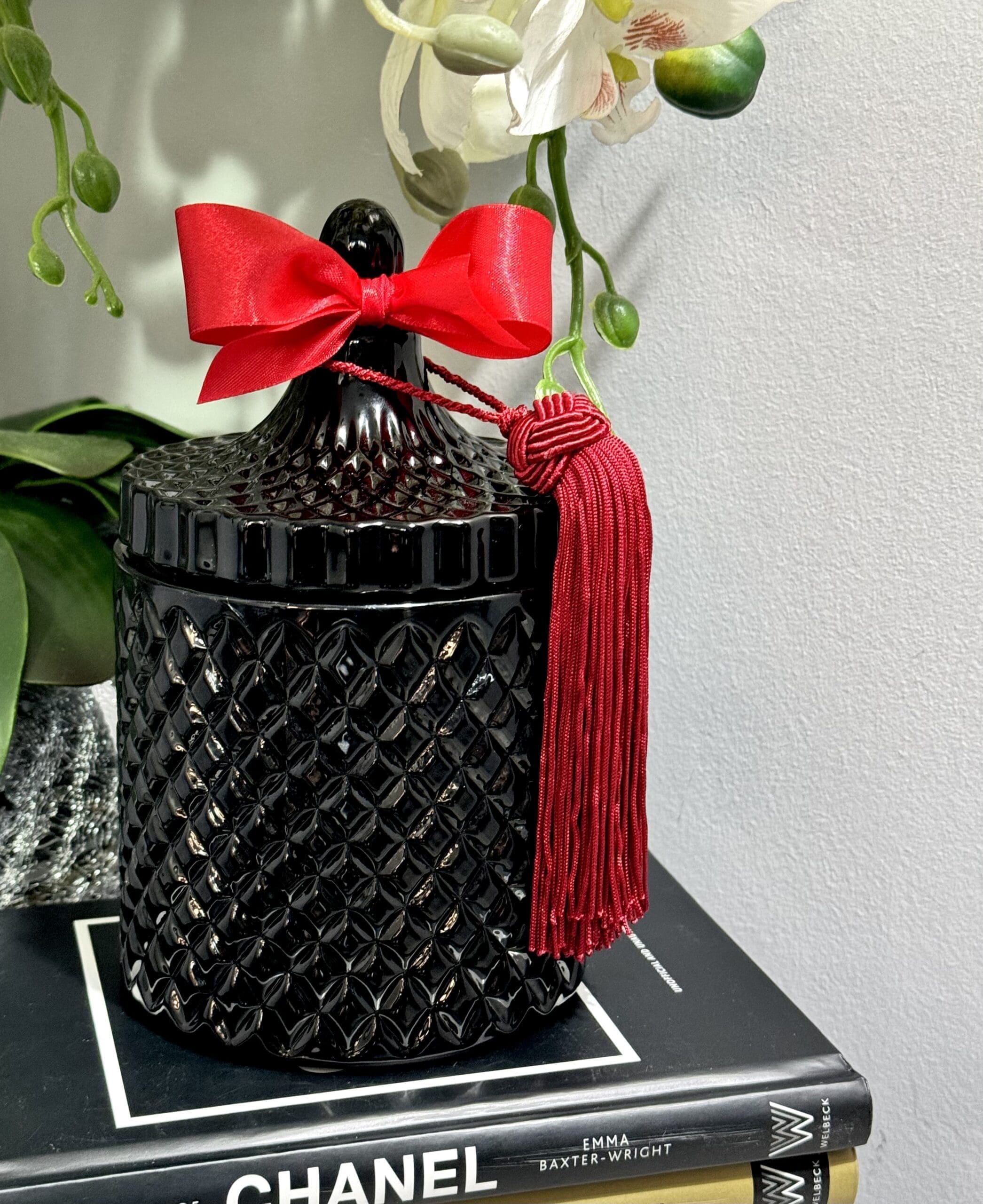 Diamond Queen candle, weighing 650 grams, features an intricately designed glass container with a texture diamond pattern. The lid, which mirrors the container’s elegant design, is topped with a decorative finial and adorned with a vibrant satin bow. A matching tassel adds a touch of luxury, hanging gracefully from the bow. This sophisticated candle is a perfect addition to any stylish home décor, especially those with a contemporary or luxurious theme. The container’s rich texture and striking embellishments make it a standout decorative piece, suitable for display in any room.