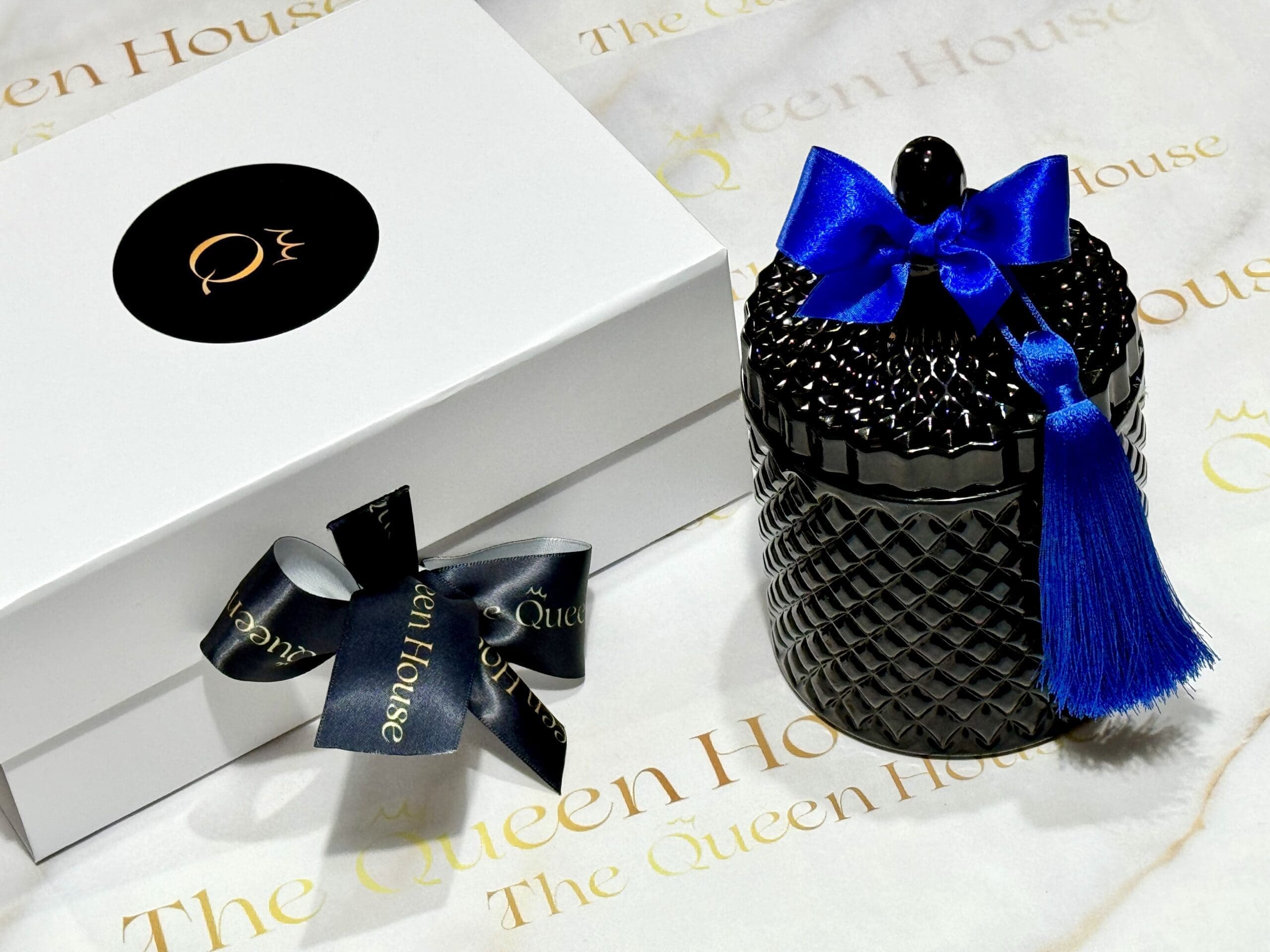 Diamond Queen candle, weighing 650 grams, features an intricately designed glass container with a texture diamond pattern. The lid, which mirrors the container’s elegant design, is topped with a decorative finial and adorned with a vibrant satin bow. A matching tassel adds a touch of luxury, hanging gracefully from the bow. This sophisticated candle is a perfect addition to any stylish home décor, especially those with a contemporary or luxurious theme. The container’s rich texture and striking embellishments make it a standout decorative piece, suitable for display in any room.