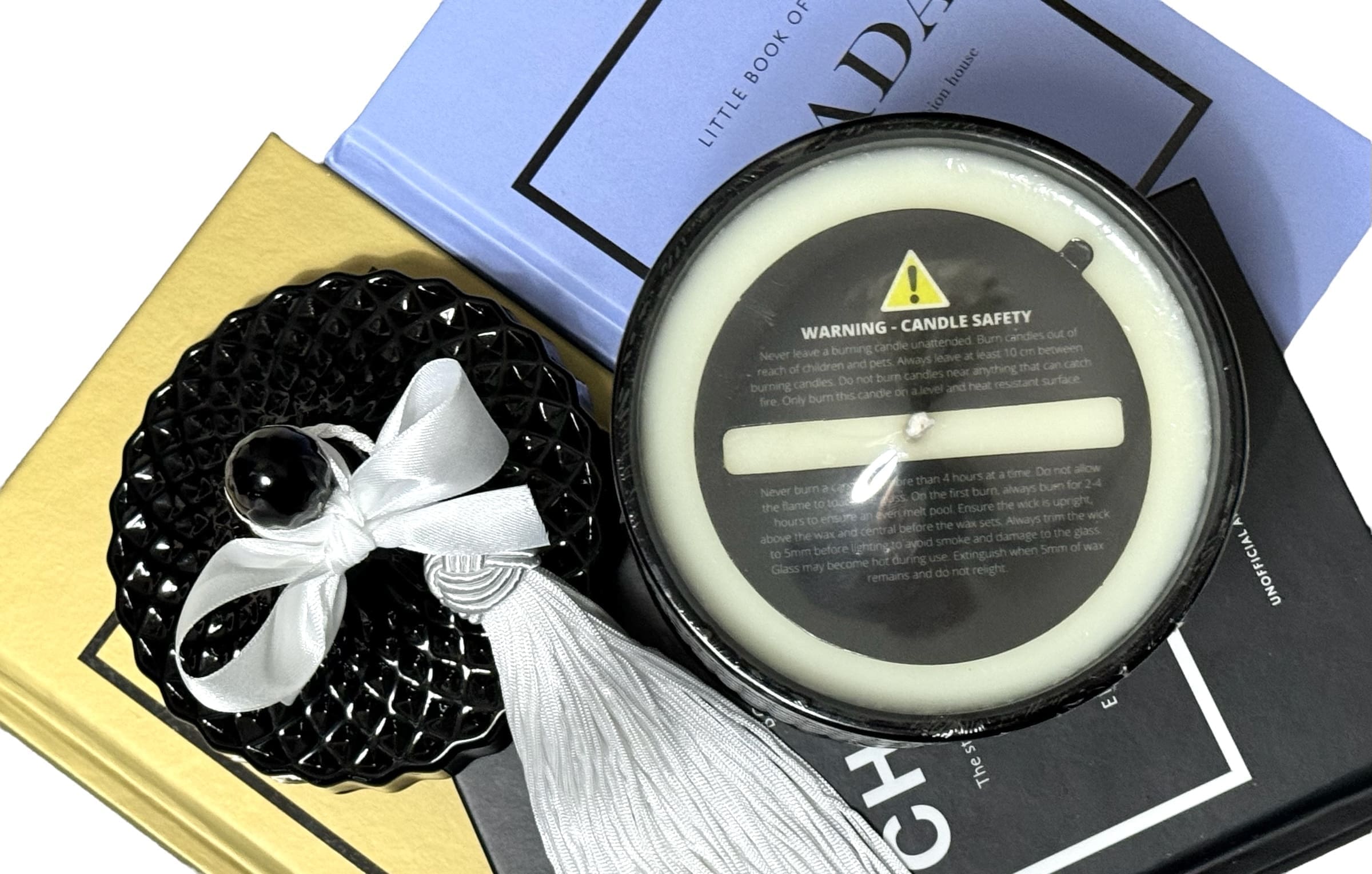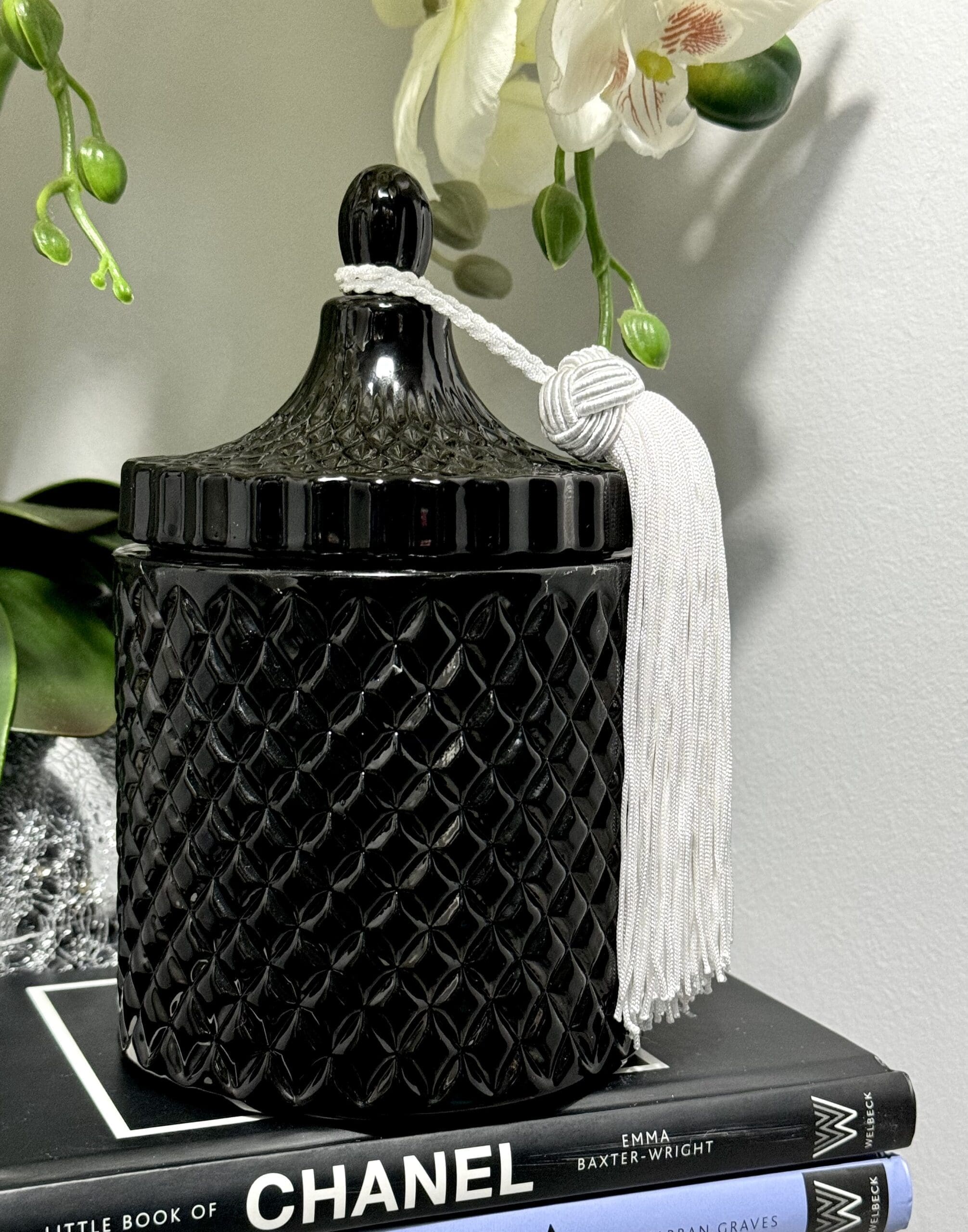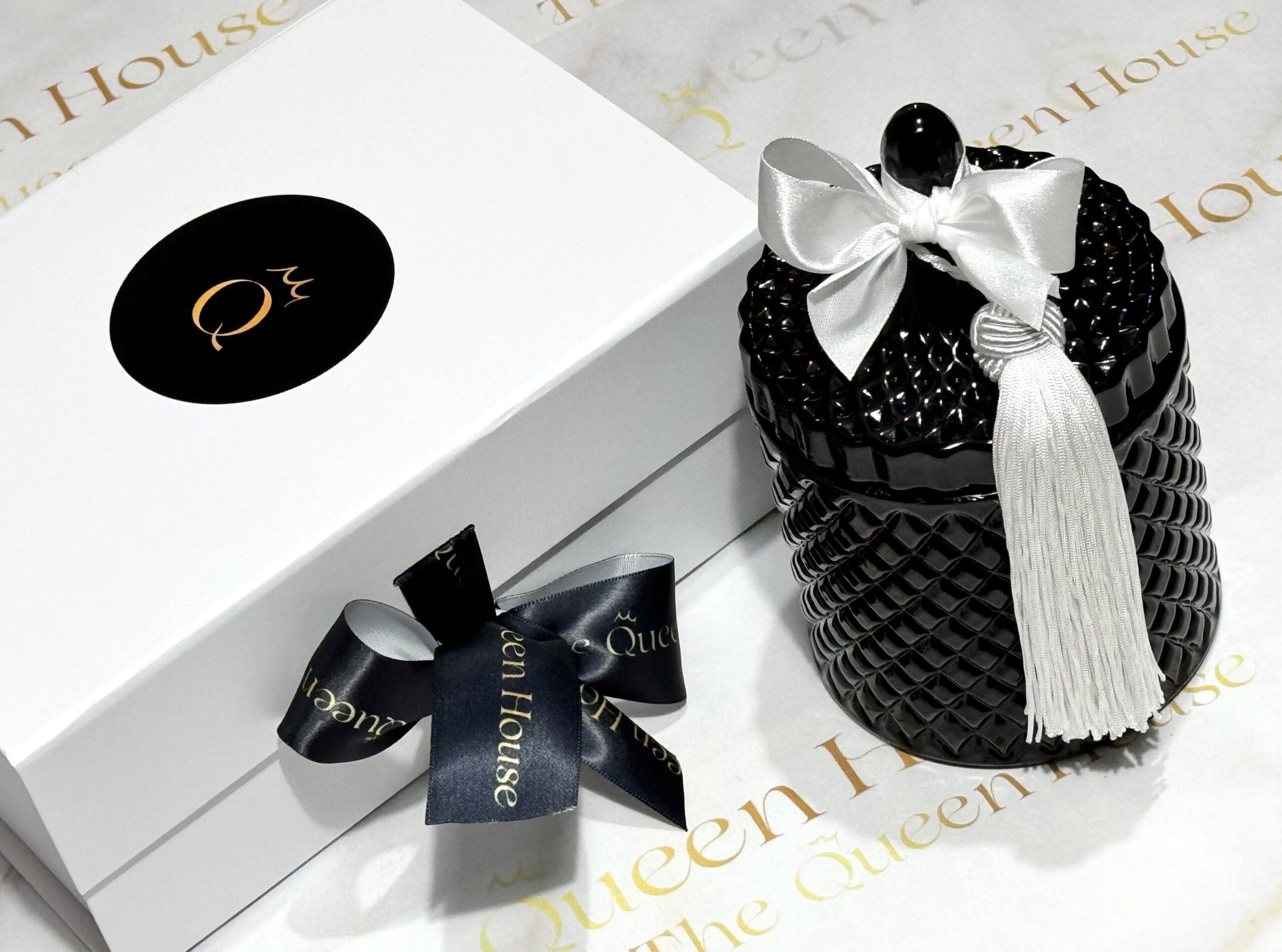Diamond Queen candle, weighing 650 grams, features an intricately designed glass container with a texture diamond pattern. The lid, which mirrors the container’s elegant design, is topped with a decorative finial and adorned with a vibrant satin bow. A matching tassel adds a touch of luxury, hanging gracefully from the bow. This sophisticated candle is a perfect addition to any stylish home décor, especially those with a contemporary or luxurious theme. The container’s rich texture and striking embellishments make it a standout decorative piece, suitable for display in any room.