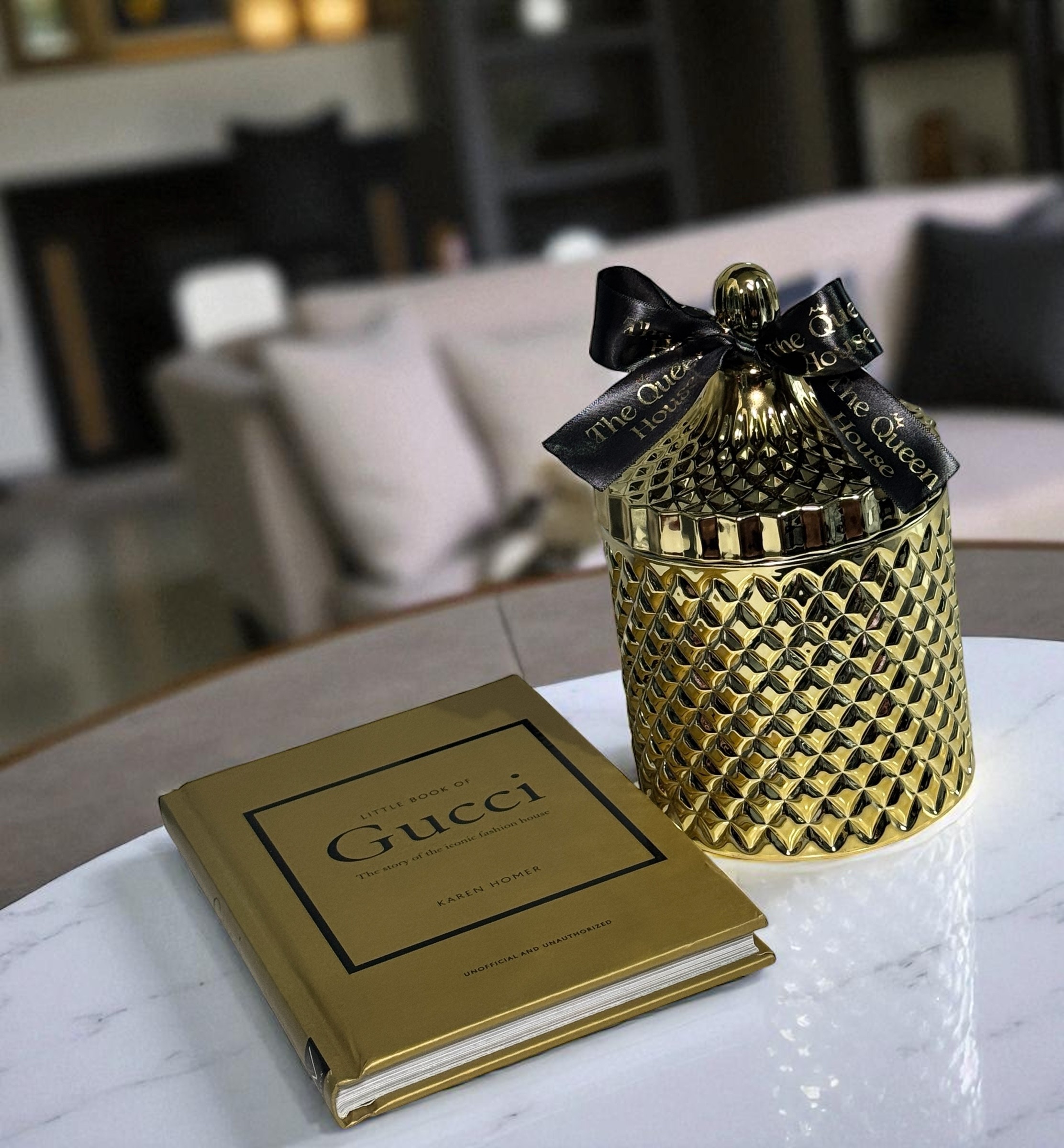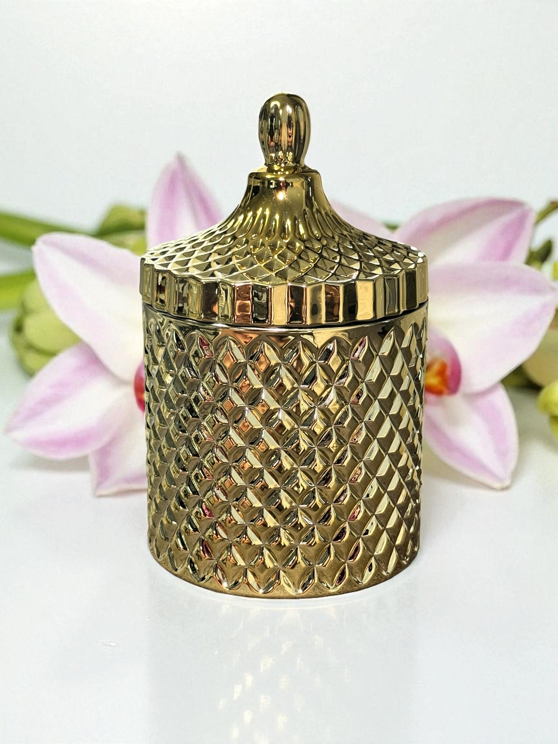 Diamond Queen candle, weighing 650 grams, features an intricately designed glass container with a texture diamond pattern. The lid, which mirrors the container’s elegant design, is topped with a decorative finial and adorned with a vibrant satin bow. This sophisticated GOLD candle is a perfect addition to any stylish home décor, especially those with a contemporary or luxurious theme. The container’s rich texture and striking embellishments make it a standout decorative piece, suitable for display in any room.
