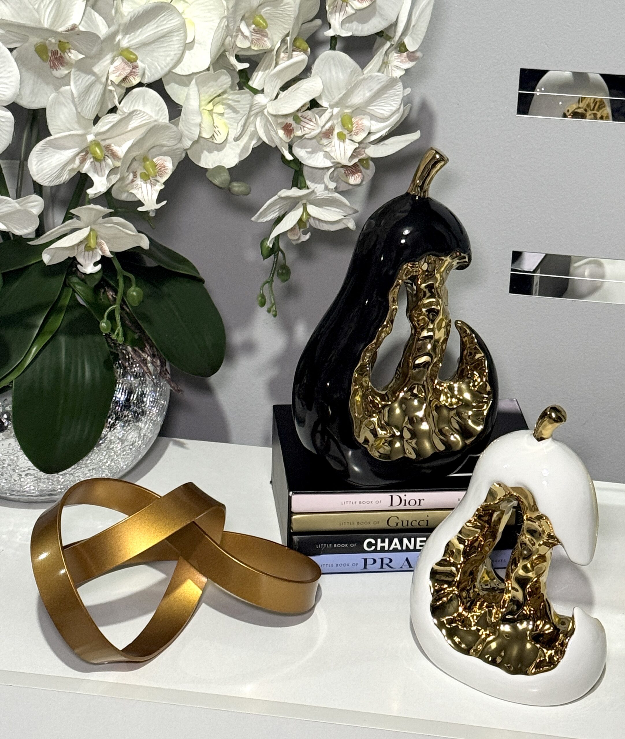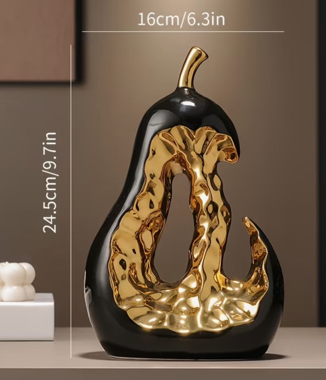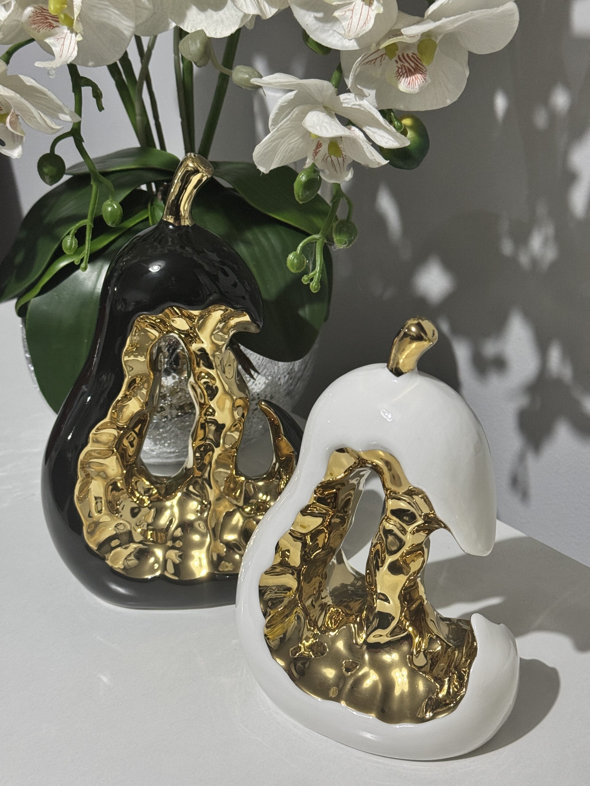 Bring bold elegance to your home with „Opulent Glow“ – a striking ceramic pear sculpture. Its deep black ceramic surface contrasts beautifully with the golden inner detail, adding luxury and mystery to any interior. A perfect choice for a modern statement piece.