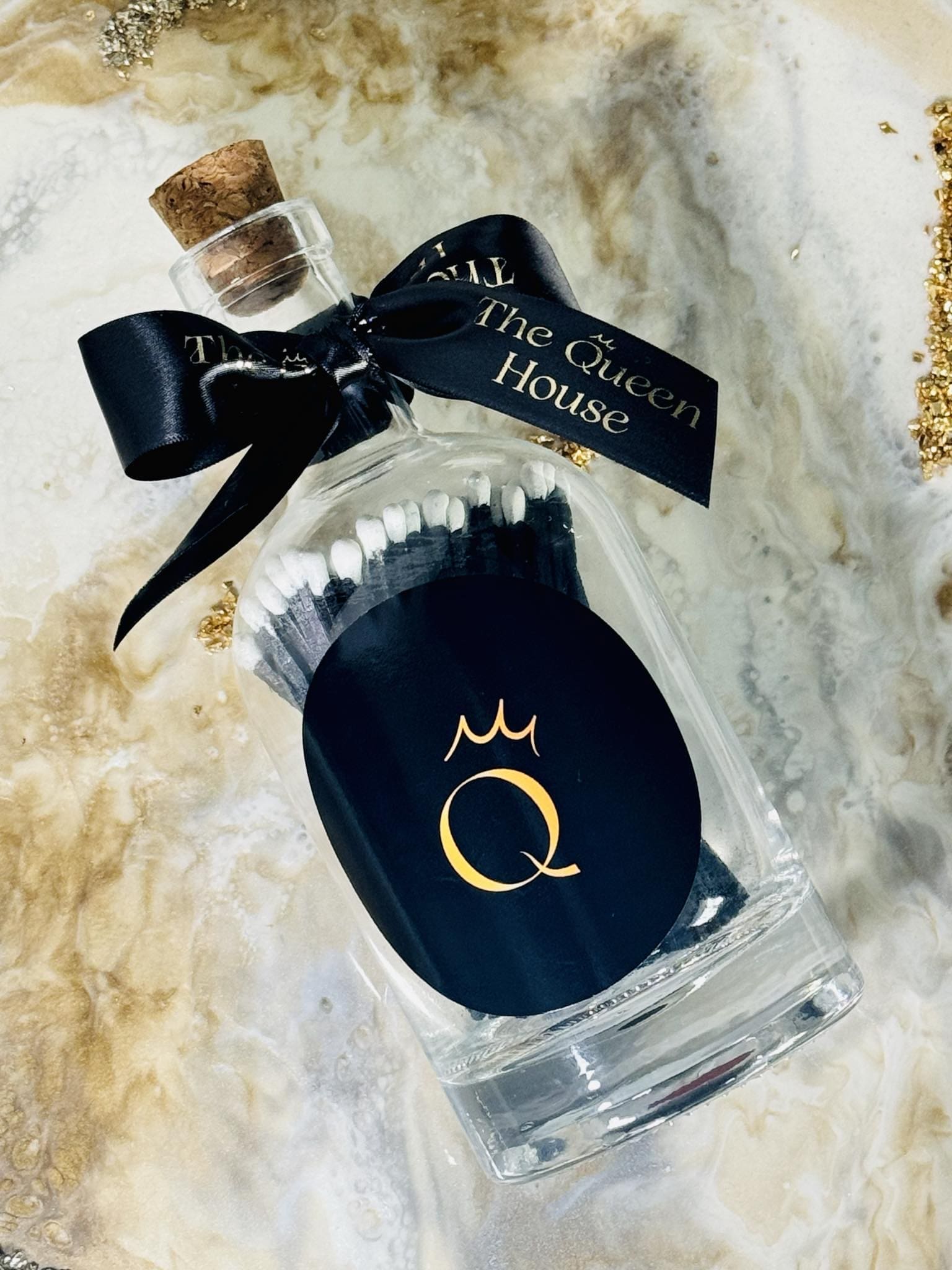 Introducing our luxury matchstick set, elegantly displayed in a refined glass jar adorned with a sleek cork lid and finished with a sophisticated black satin ribbon embossed with gold branding. Inside, you’ll find premium white-tipped matches, perfectly complementing any luxury candle collection. The jar’s minimalist design, featuring our distinctive logo, adds a touch of elegance and serves as a striking decor piece, while its functionality makes it a must-have for candle enthusiasts. Elevate your candle-lighting ritual with this stunning addition that pairs perfectly with our luxurious candles, creating a timeless and cohesive look in any setting. At the base of the inscription, you’ll find a convenient striker pad for easy lighting. This stylish and functional piece is the perfect addition to any candle lover’s collection, combining elegance with practicality.
