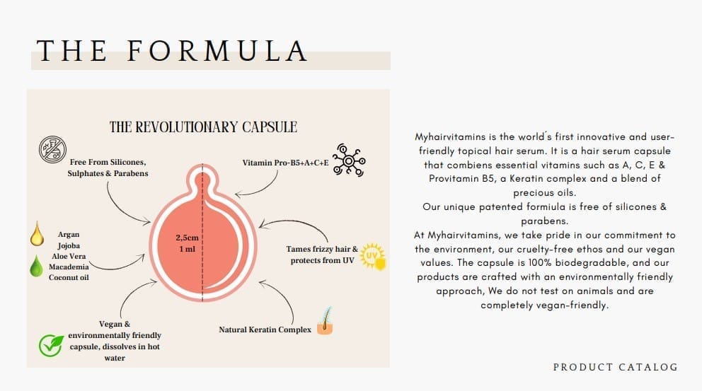 Myhairvitamins is the world´s first innovative and userfriendly topical hair serum. It is a hair serum capsule that combiens essential vitamins such as A, C, E & Provitamin B5, a Keratin complex and a blend of precious oils. Our unique patented formiula is free of silicones & parabens. At Myhairvitamins, we take pride in our commitment to the environment, our cruelty-free ethos and our vegan values. The capsule is 100% biodegradable, and our products are crafted with an environmentally friendly approach, We do not test on animals and are completely vegan-friendly.