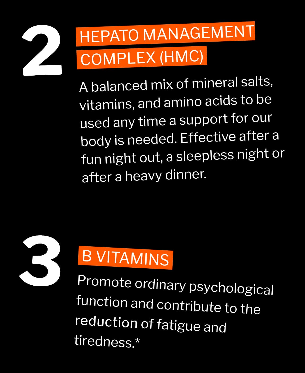 Formulated as orange-flavoured effervescent tablets, Night Out is specially designed to relieve hangover symptoms. This supplement supports both physical and mental performance, combining essential minerals and detoxifying blends to help your body eliminate toxins caused by alcohol consumption. It provides natural energy without stimulants like caffeine.